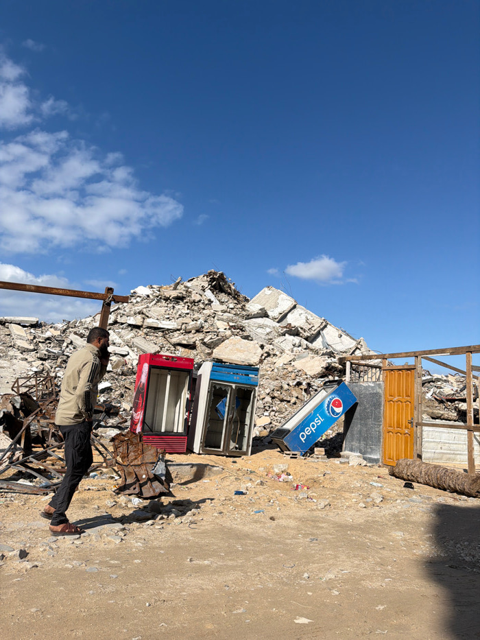 A man stands amidst rubble, seemingly from a destroyed building, identifiable by large concrete pieces. Scattered debris surrounds him. A tilted Pepsi cooler and two vending machines, one red and one…read more