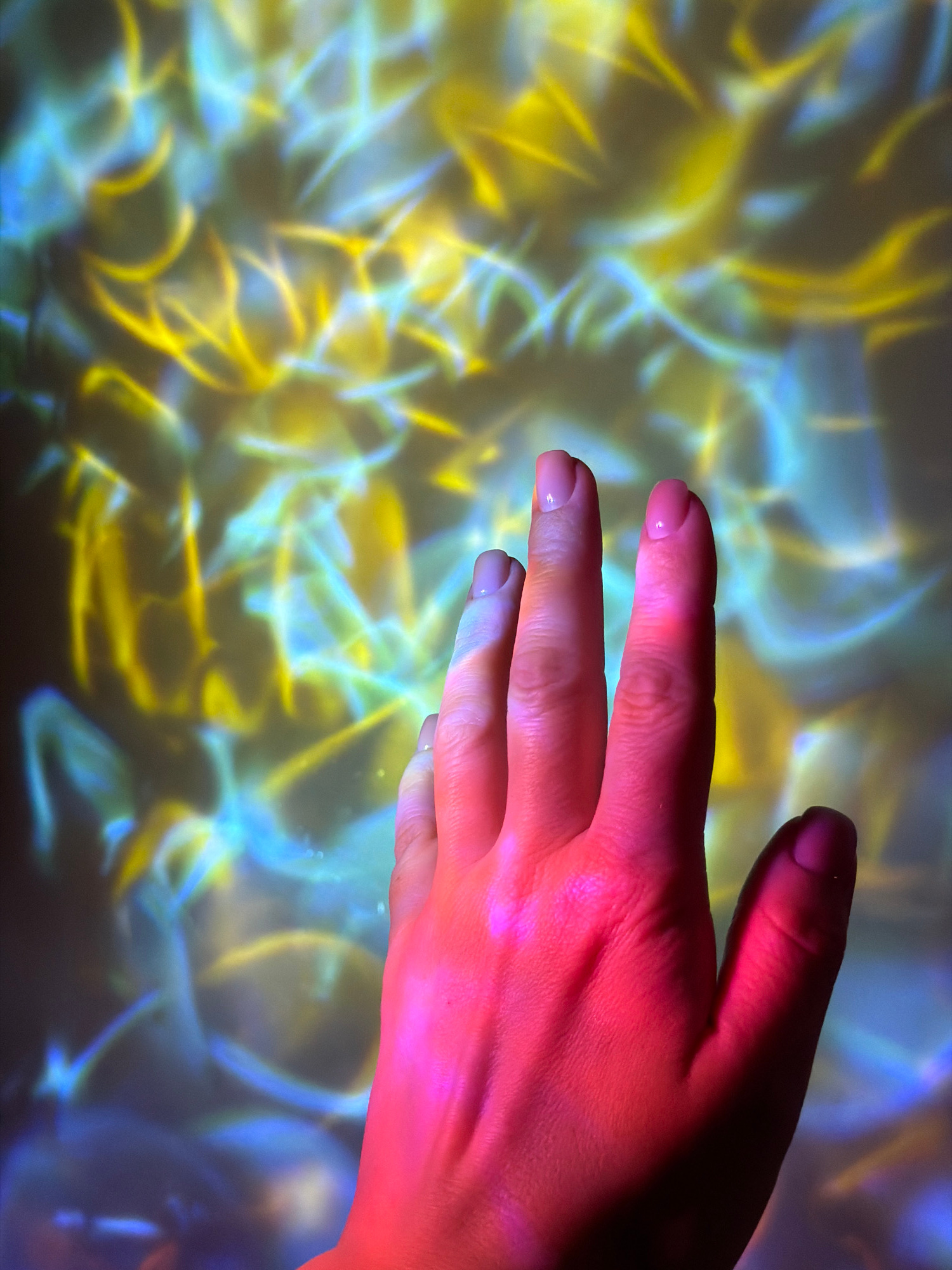 A person's right hand, illuminated with a reddish-pink light, is positioned in front of a backdrop of blurry, multi-colored light streaks, predominantly yellow and blue. The hand is in focus while the…read more