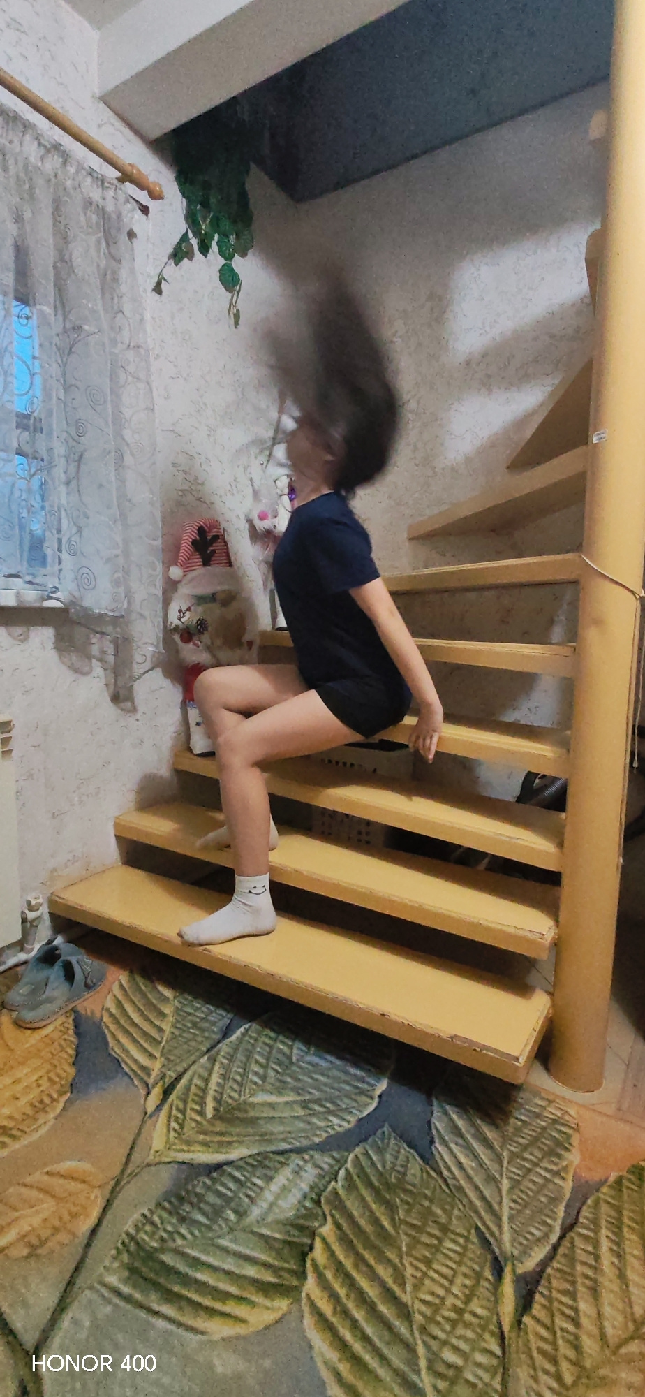 The photograph shows a person with dark hair that is blurred, likely due to motion. The person is sitting on wooden stairs with a yellow tint. They are wearing a dark blue t-shirt and dark shorts. On…read more