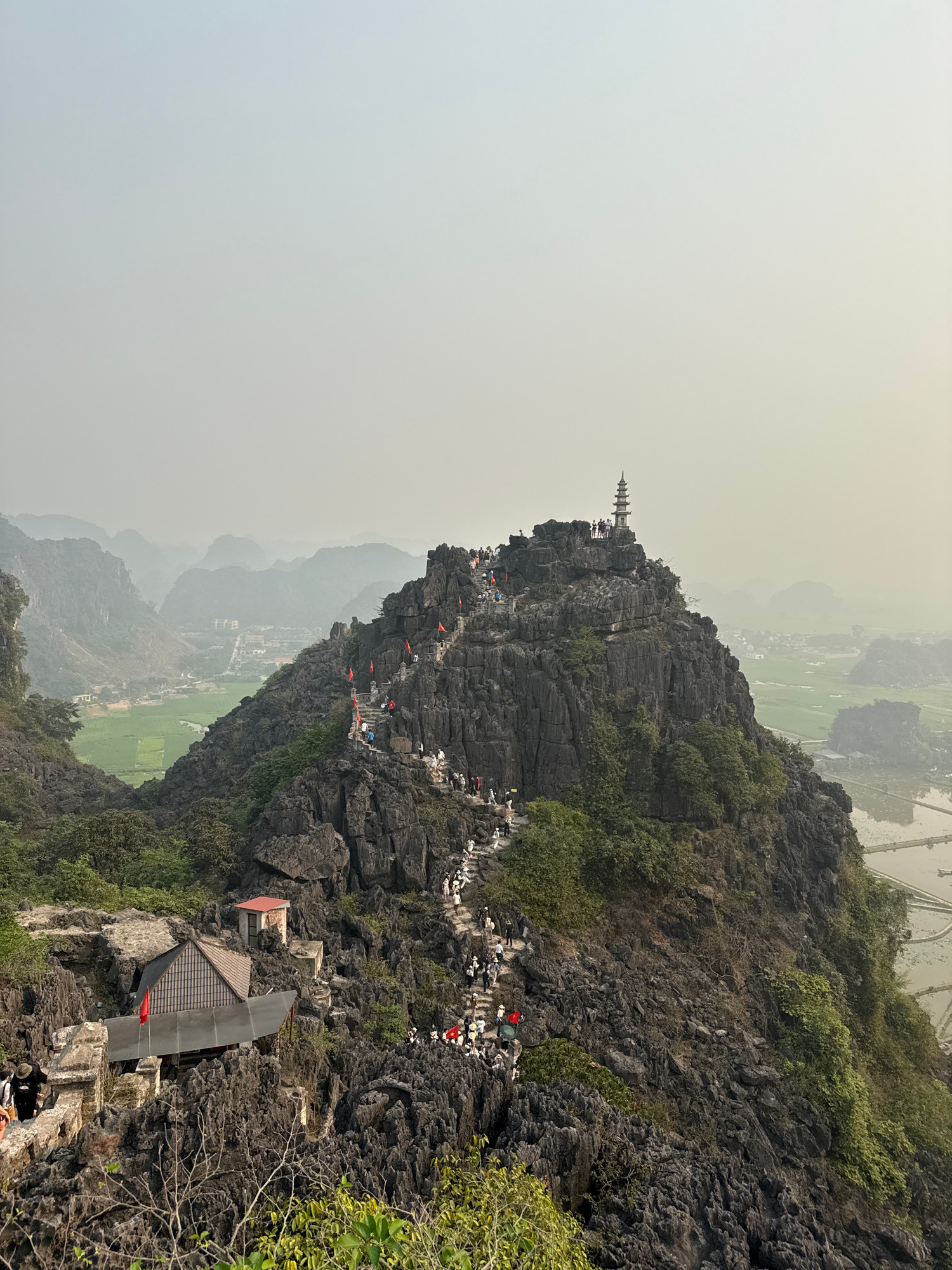 A mountain peak in Nam Hoa Lư Ward, Vietnam, is featured on a hazy day. A pagoda structure sits at the very top of the mountain, reachable by a steep stone path. Numerous people can be seen walking up…read more