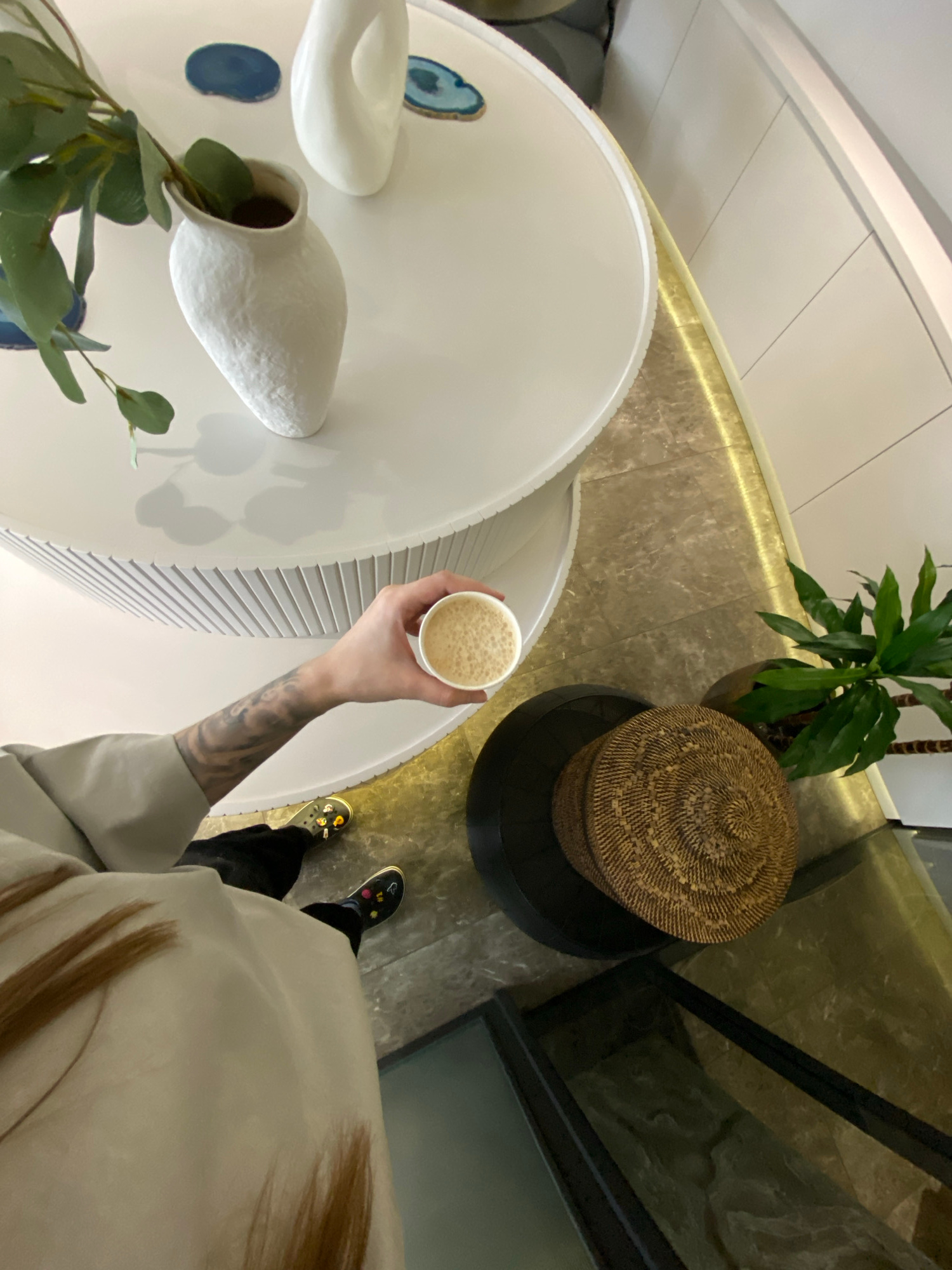 A top-down shot depicts a person holding a cup of coffee in a room with modern decor. The person, visible from the torso down, wears black pants, sandals adorned with stickers, and a light-colored shi…read more