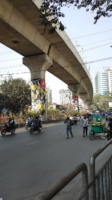 The image depicts a daytime street scene in the Kawran Bazar area of Dhaka, Bangladesh, beneath the elevated viaduct of the Dhaka Metro Rail (MRT Line 6). A large, light-colored concrete metro rail vi…read more