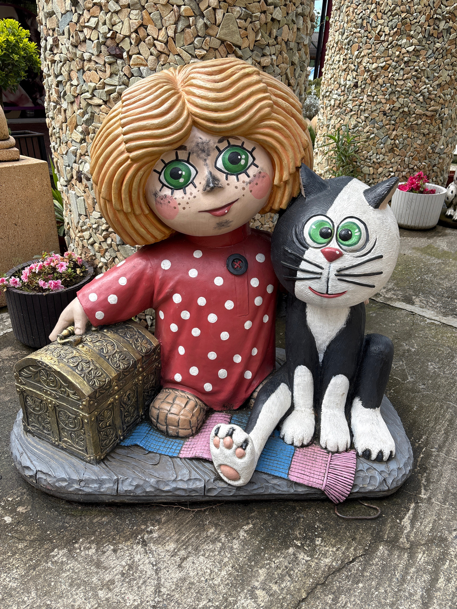 The image shows a garden statue featuring a blonde-haired doll wearing a red polka-dot shirt with a button, lying on its back. A black and white cat statue is lying on top of the doll. The cat is posi…read more