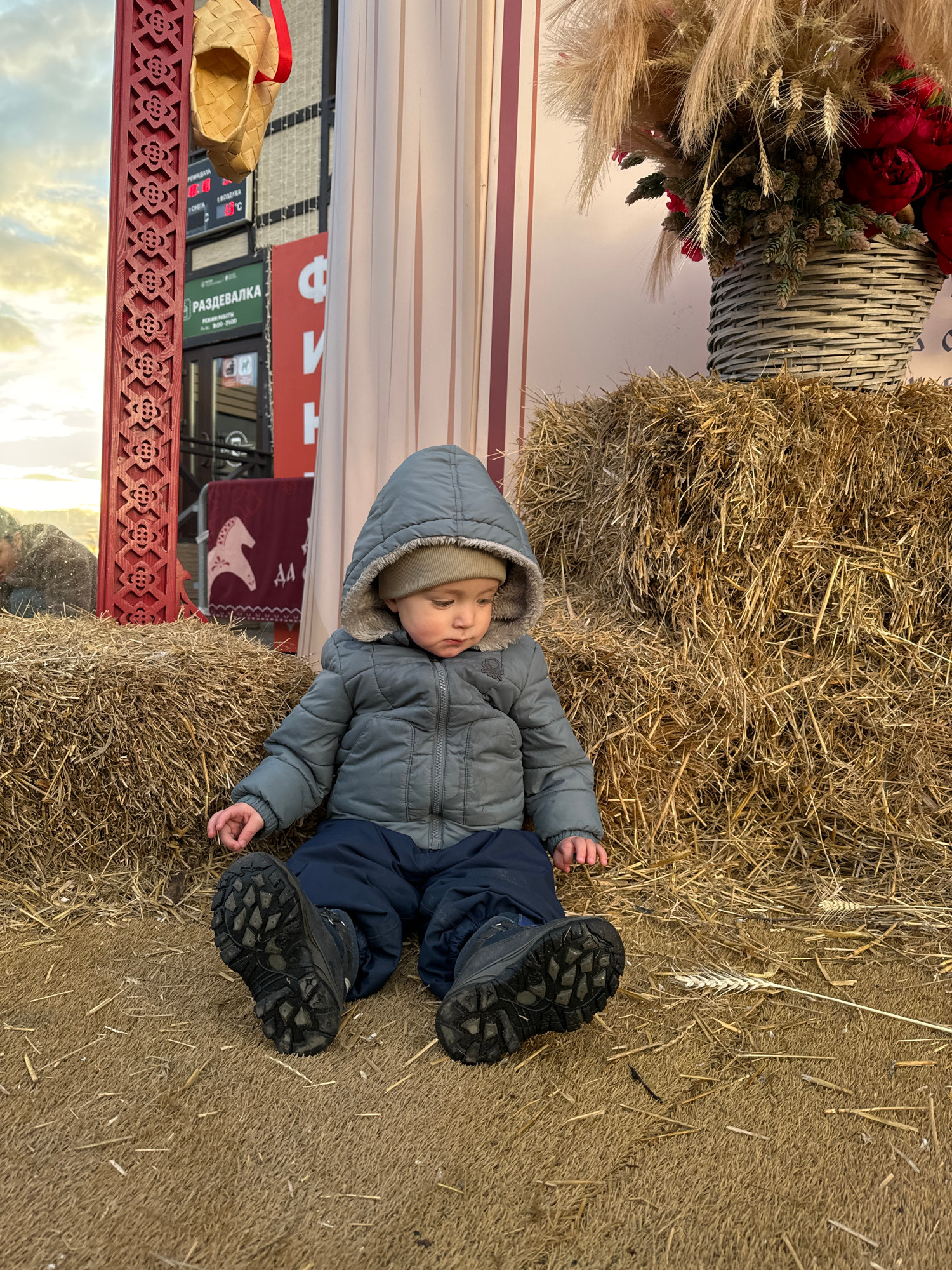 A child is seated on a surface covered with loose hay and straw. The child wears a gray hooded puffer jacket with a light-colored fur trim, a beige knit beanie, dark blue snow pants, and black winter…read more