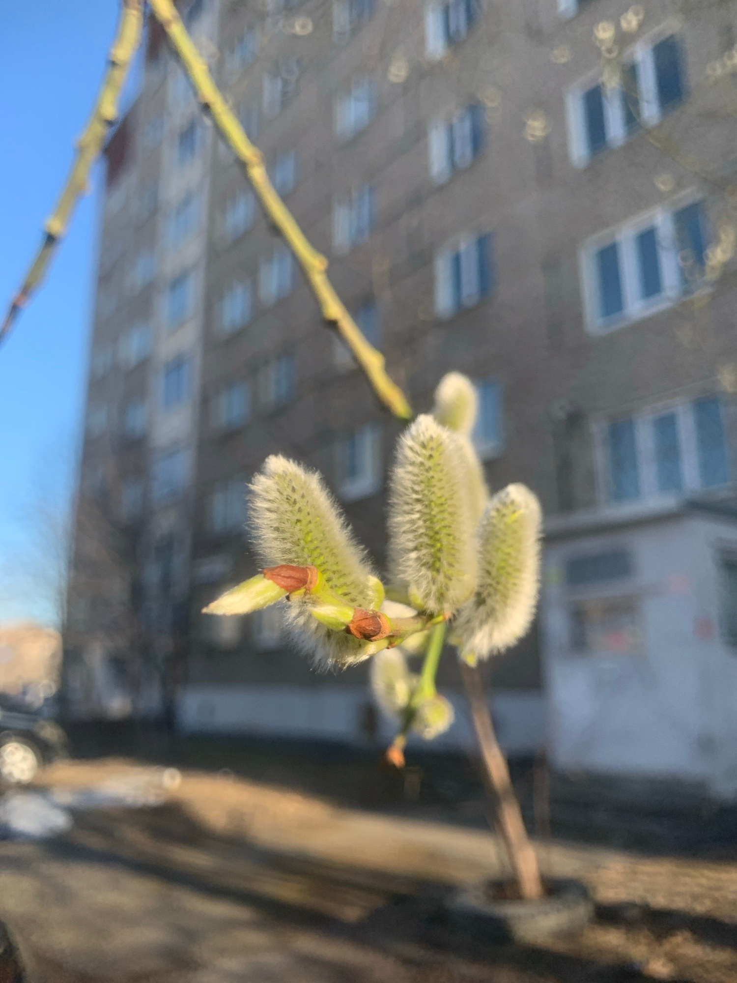 The image captures a close-up of several pussy willow (Salix caprea or similar species) branches, adorned with soft, fuzzy, pale green catkins. These catkins, a sign of early spring, are in sharp focu…read more