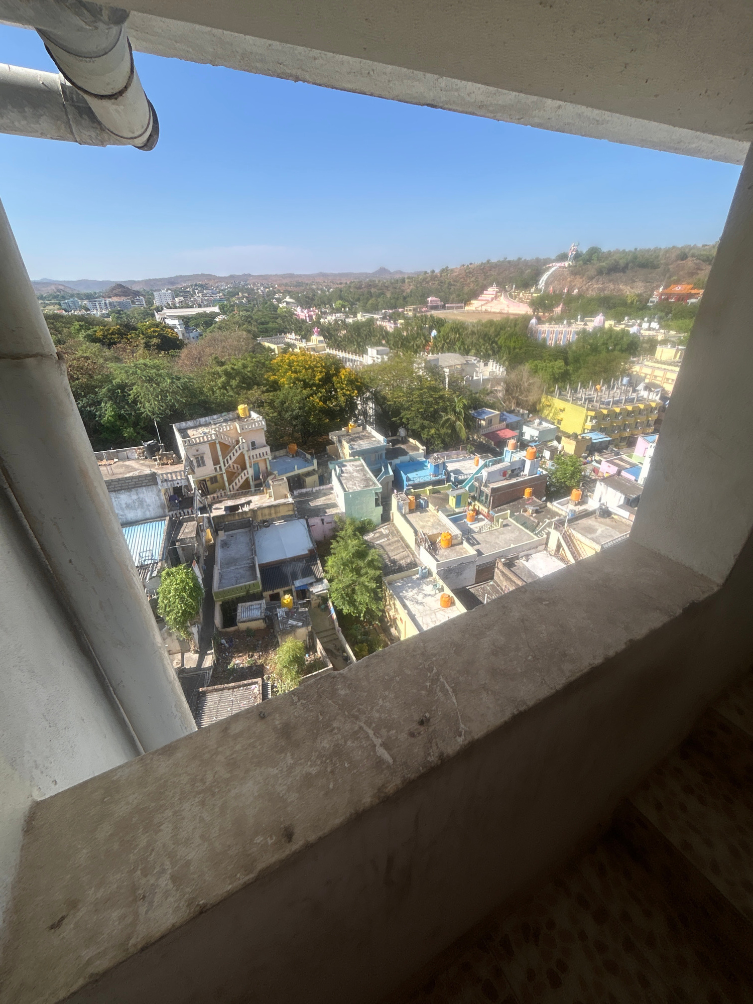 The scene is a view from an elevated position, possibly a building, in Puttaparthi, India. A concrete structure frames the view of a dense cityscape transitioning into a forested area in the backgroun…read more