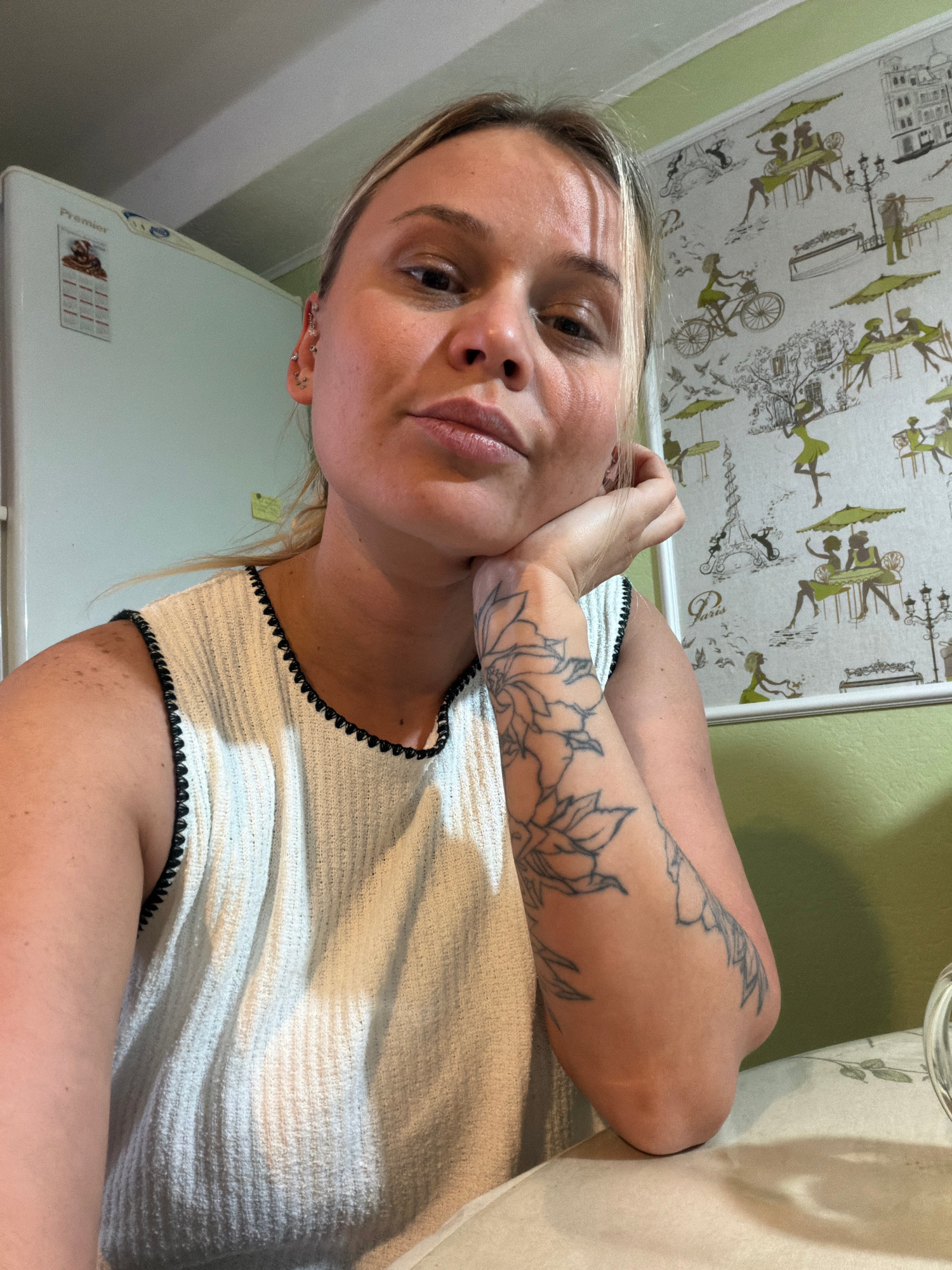 A woman with fair skin and blonde hair is posing for a selfie in an indoor environment. She has a floral tattoo on her left arm. She is wearing a white textured top with black trim. Her hand is near h…read more