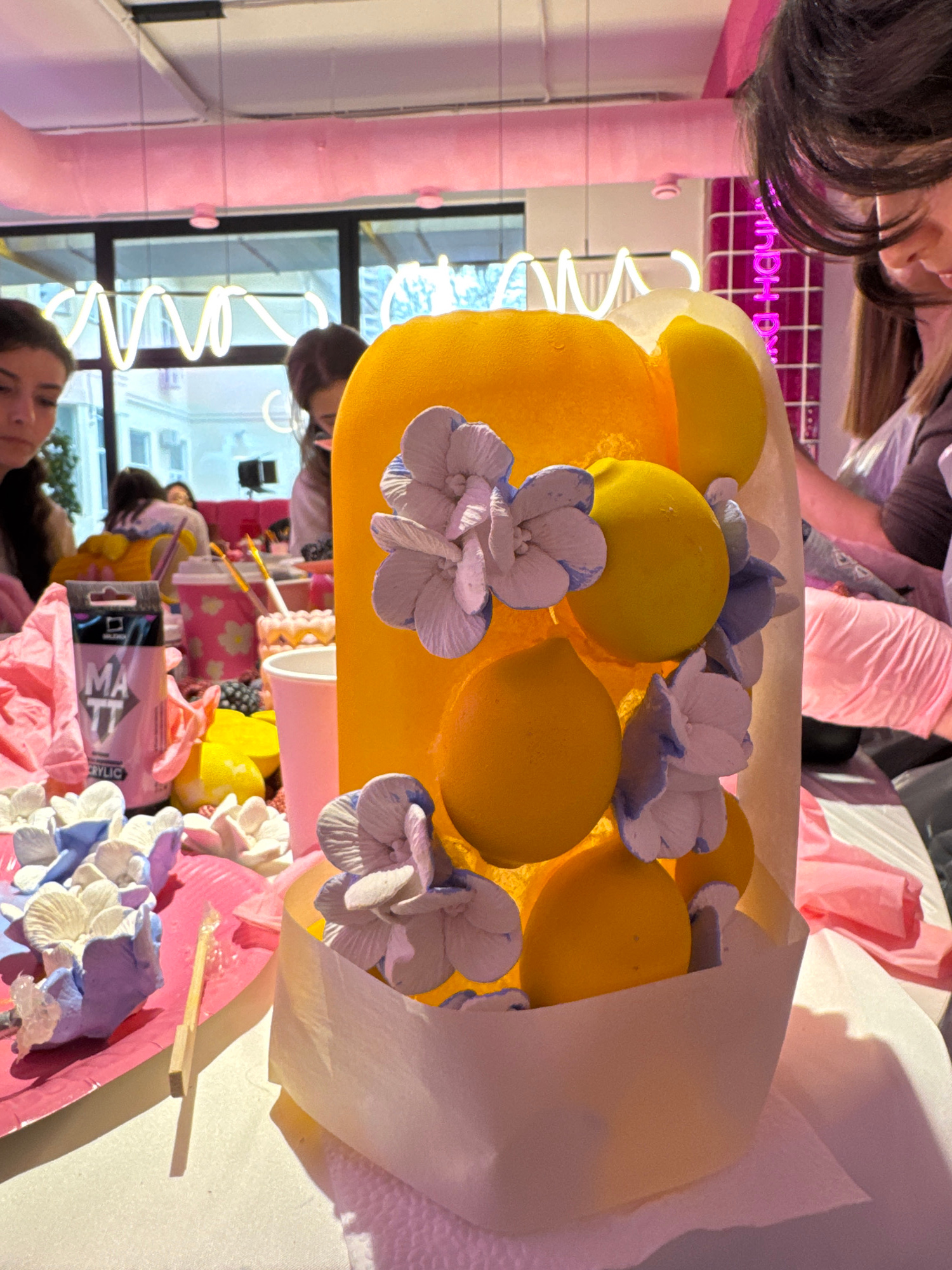 A close-up, eye-level shot captures a vibrant scene, likely indoors, with a focus on crafting and decorative elements. The primary subject is a creative arrangement featuring a collection of artificia…read more