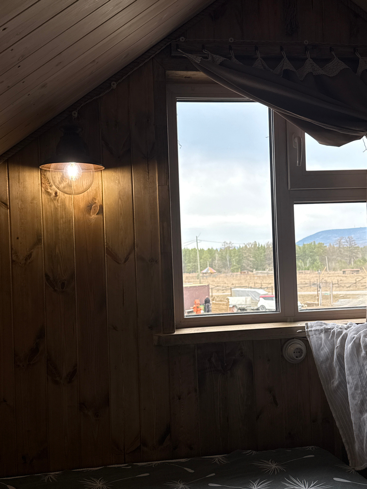 A photograph taken indoors depicts a window overlooking an outdoor scene. The window, situated in a wooden-paneled room with an angled ceiling, frames a view of Tyulyuk, Russia. Through the window, a…read more