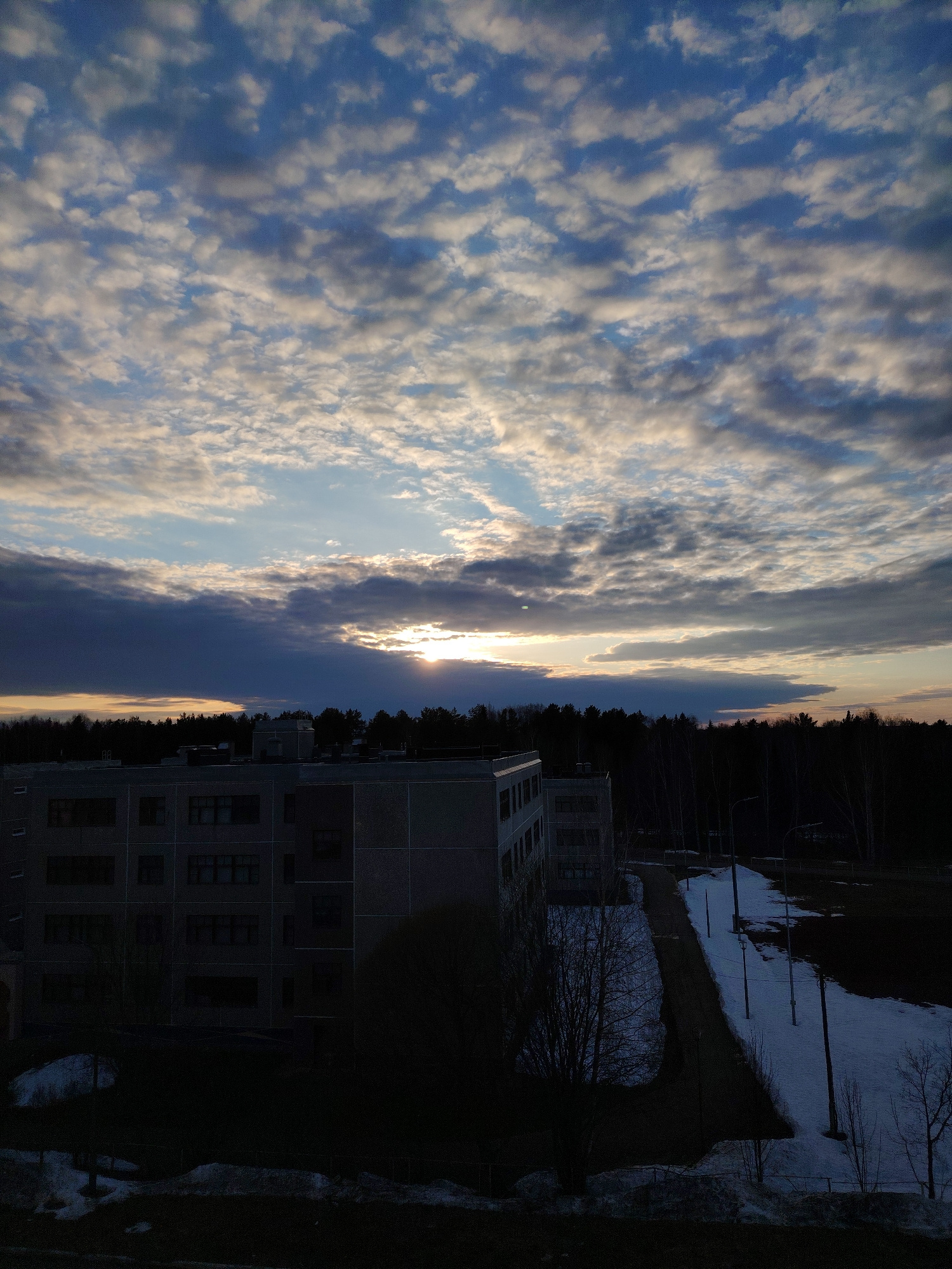 The photograph, taken in what appears to be the city of Марковский, Russia, depicts an urban landscape under a sky filled with altocumulus clouds during a sunset. A large, multi-story building with a…read more
