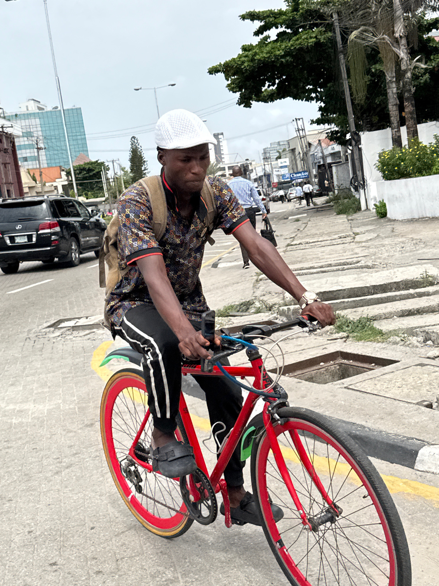 A man wearing a white kufi cap, a patterned shirt, black pants with white stripes, and black shoes is riding a red bicycle on a paved road. He is wearing a light brown backpack and a watch on his left…read more