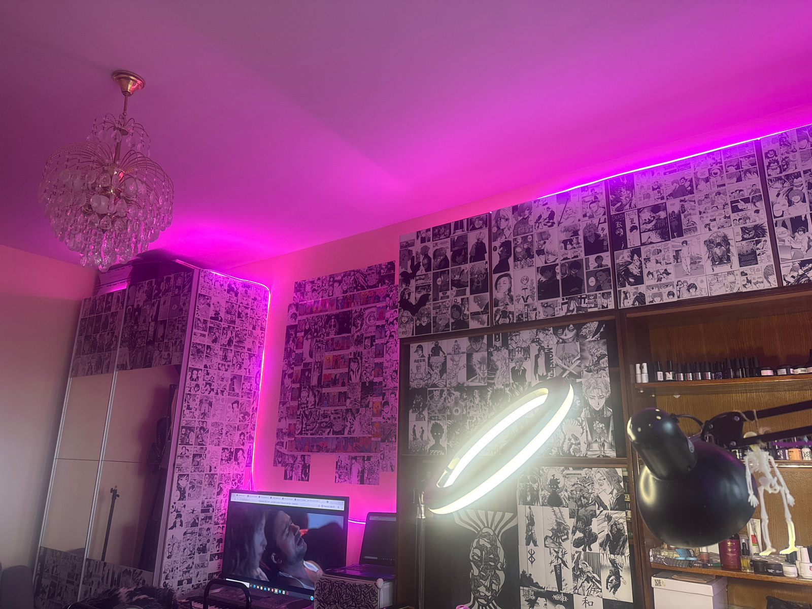 The image presents a room interior under a predominantly pink light emanating from LED strips near the ceiling. A chandelier hangs from the ceiling. The walls are covered with manga panels. There's a…read more