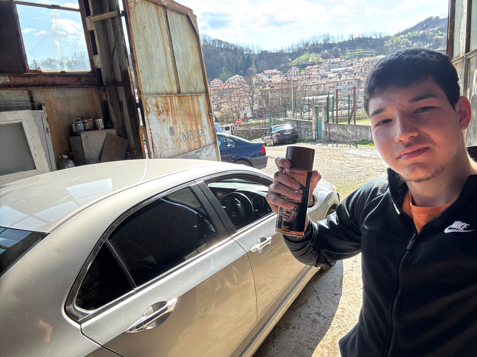 A young man is taking a selfie outdoors, holding a can of car detailing spray in his right hand. He is wearing a black Nike zip-up jacket over an orange shirt. Behind him is a silver sedan, which appe…read more