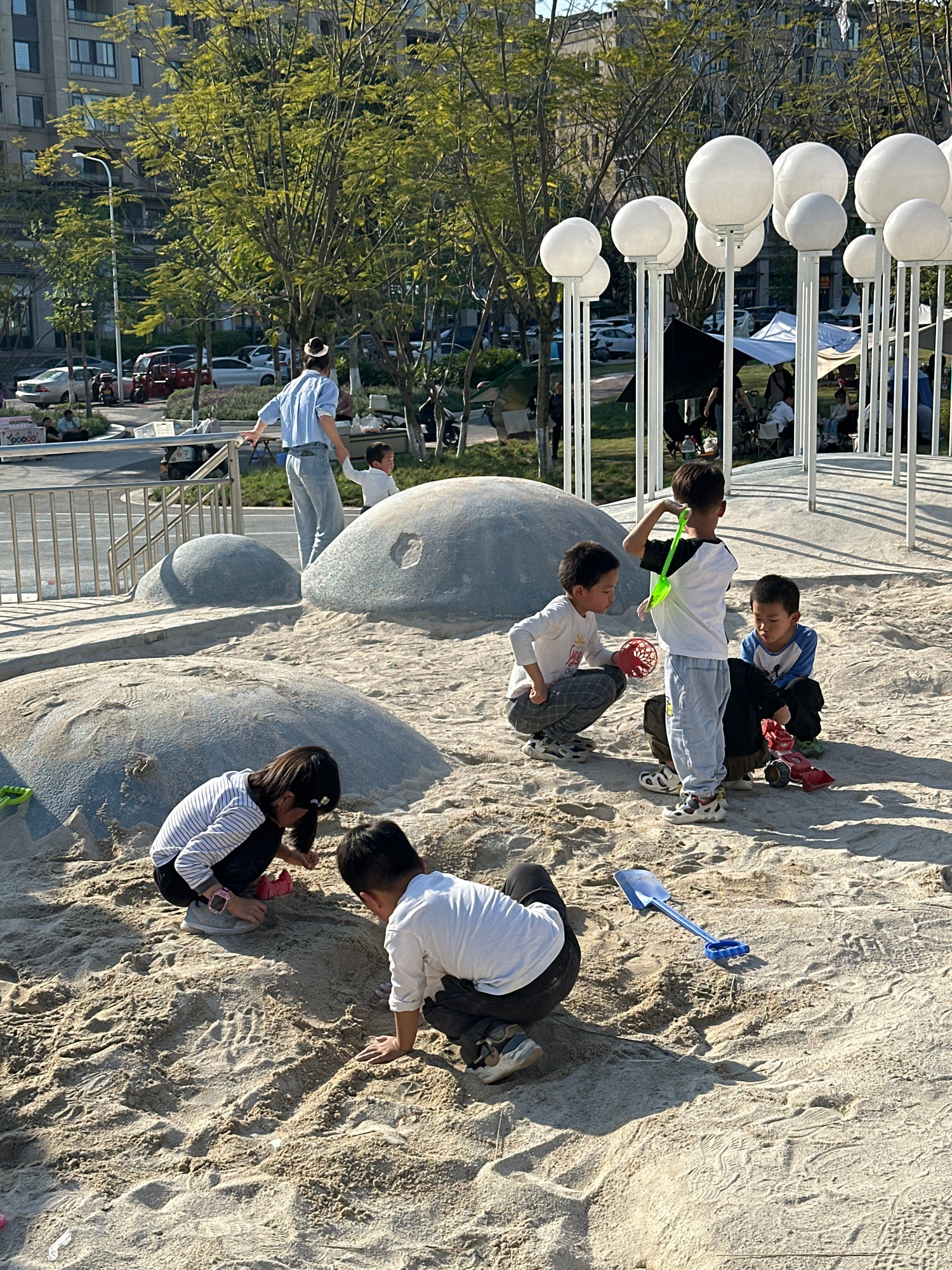 The image depicts a group of children playing in a sand pit at an outdoor park. Five children are visible, ranging in age from approximately 6 to 10 years old. They are interacting with the sand and e…read more