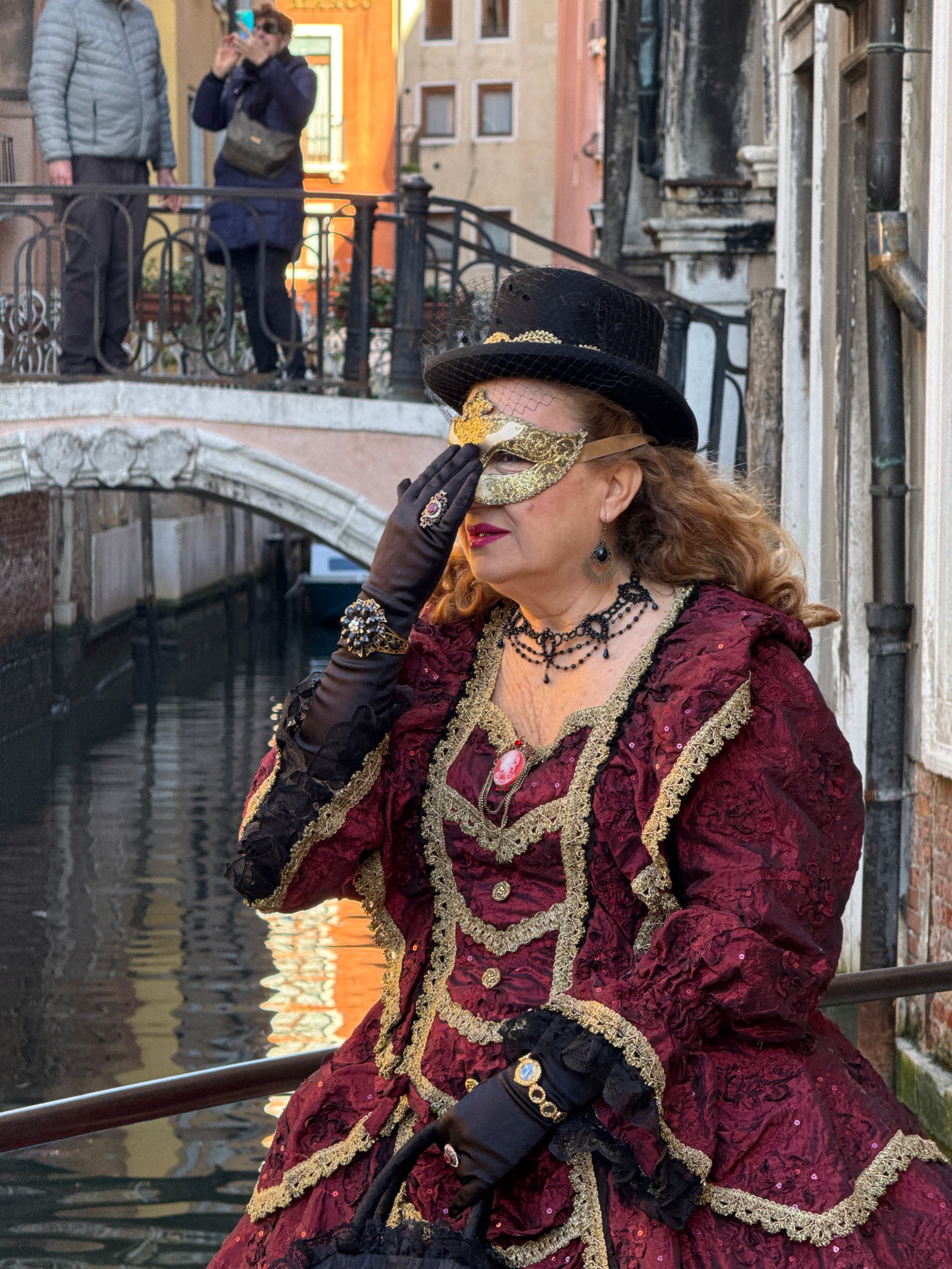 The image depicts an outdoor scene in Venice, Italy, featuring a person in an elaborate costume by a canal. In the foreground, an adult female is positioned to the right, facing slightly left, with h…read more