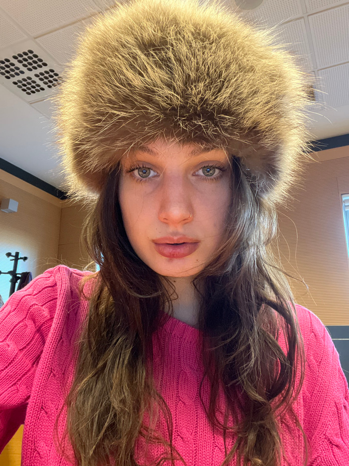 A close-up portrait depicts a female individual indoors in Milan, Italy. The subject, positioned centrally and facing the camera directly, wears a voluminous, light brown fur hat and a bright pink cab…read more