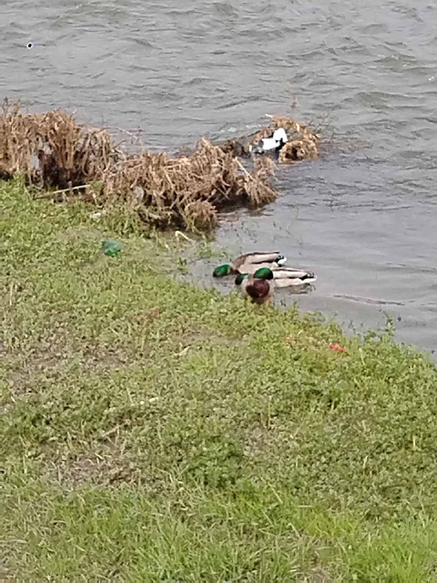 The image depicts a waterside scene. Three male Mallard ducks are swimming in the water near a grassy bank. Dry vegetation is on the bank and in the water. The water appears to be part of a river or l…read more