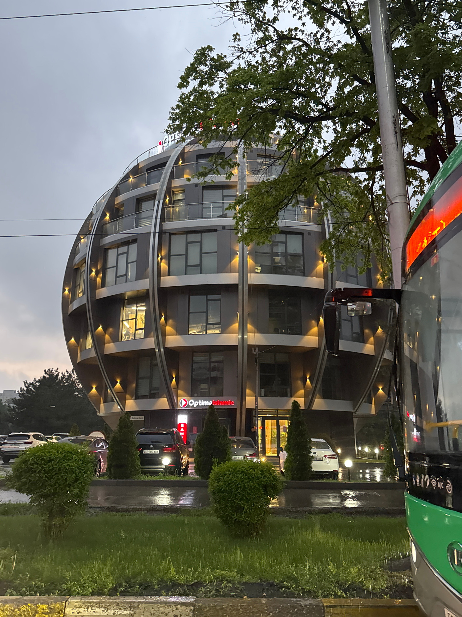 This image captures an urban street scene in Bishkek City, Kyrgyzstan, likely during the evening or late afternoon after a rainfall, given the wet pavement and reflections. The central subject is a m…read more