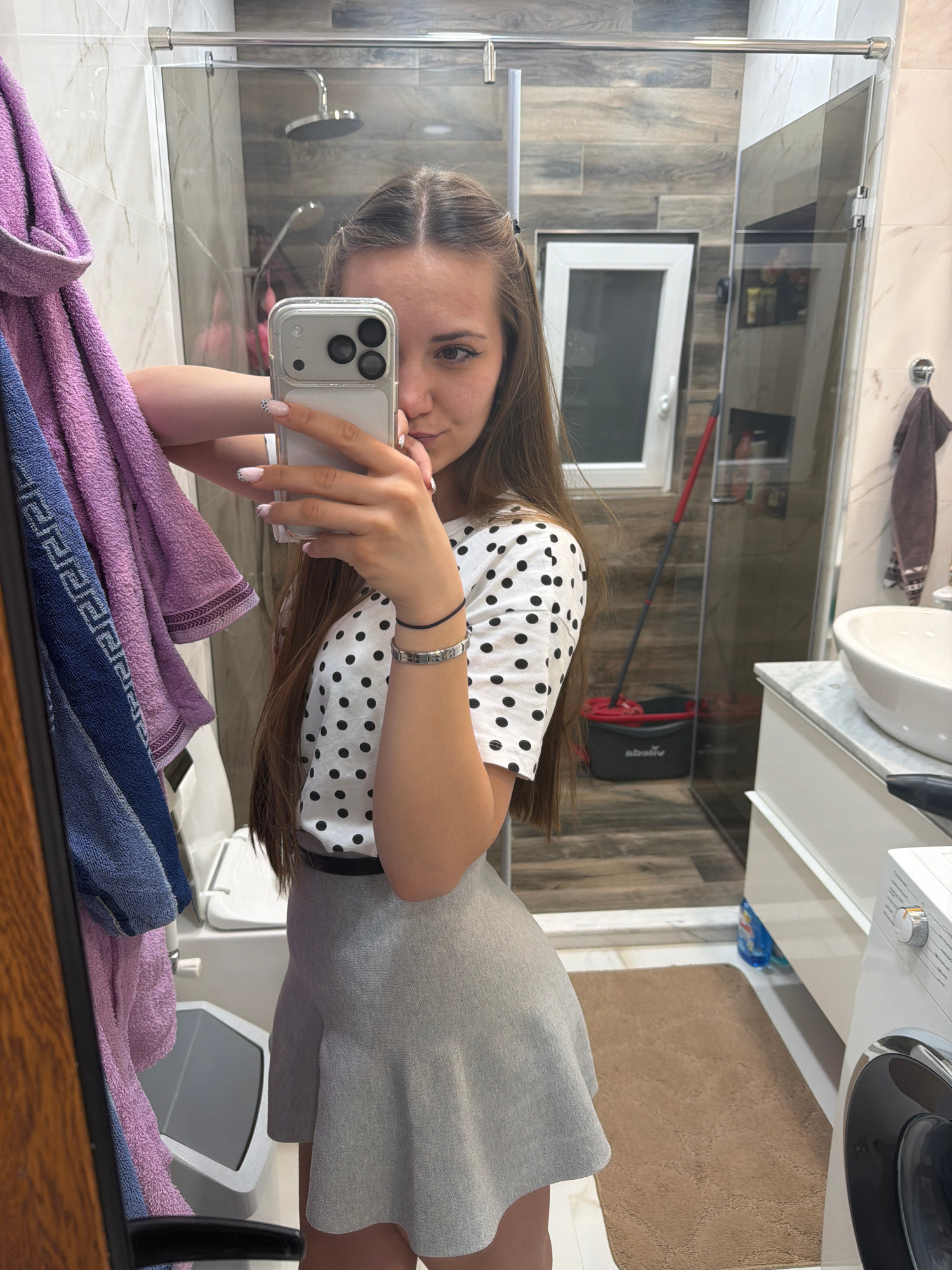 A young woman is taking a selfie in a bathroom. She is wearing a white shirt with black polka dots and a gray skirt. Her hair is long and brown. She is holding a silver iPhone with a clear case. The b…read more