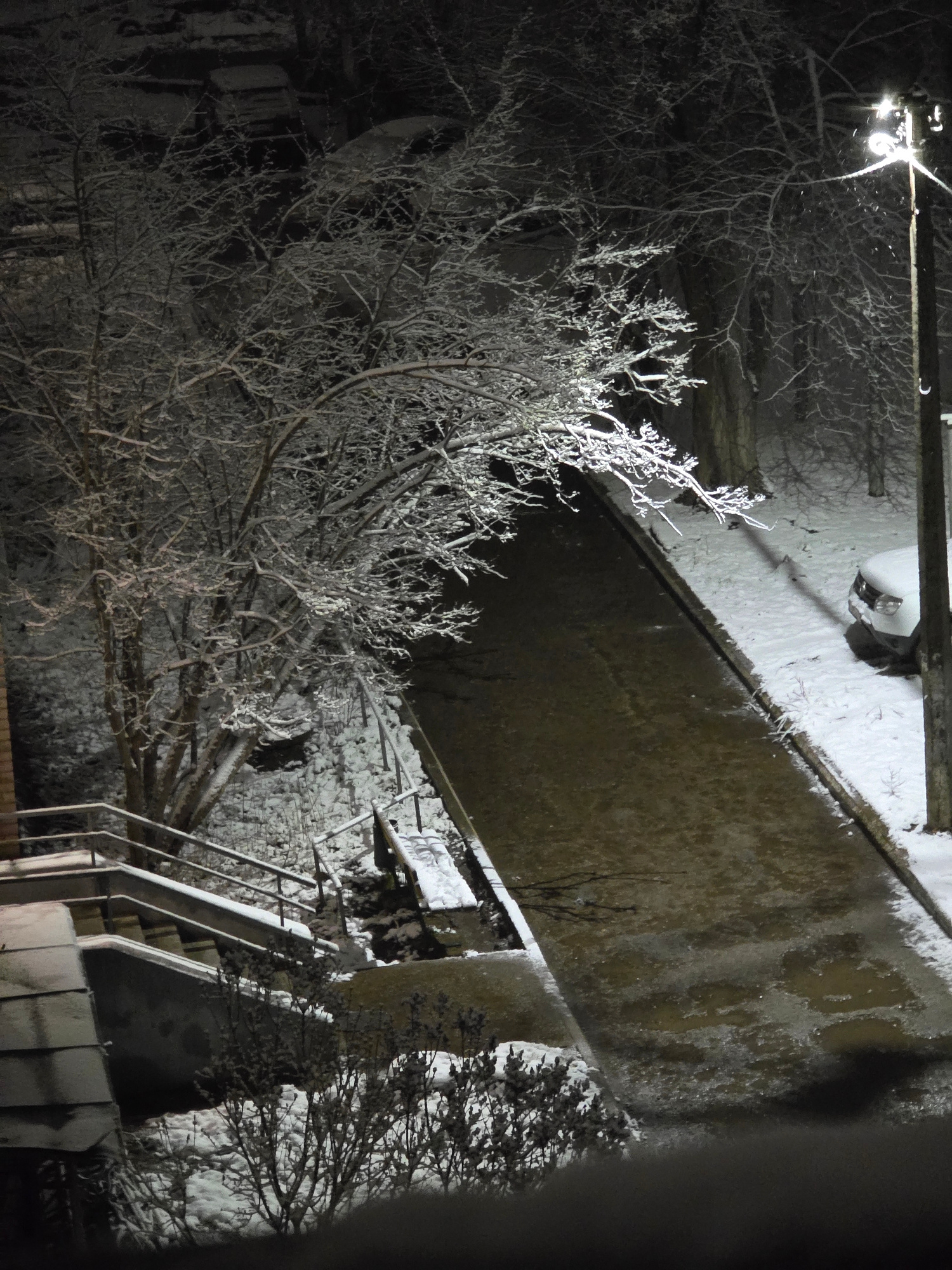 The image, taken at night in what appears to be winter, shows a street scene in Chaikovsky, Russia. A street light illuminates snow-covered trees in the foreground. Behind the trees, a bridge or eleva…read more