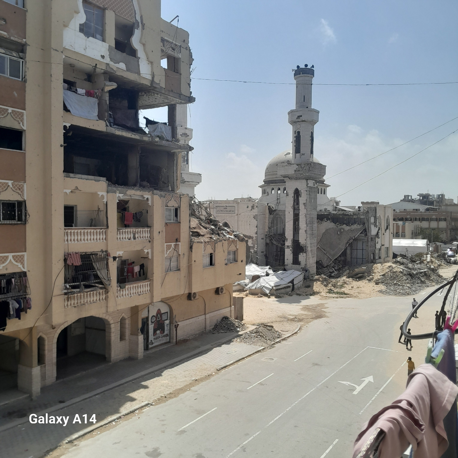 The image shows severe destruction in what appears to be a street scene in Khan Yunis, Palestinian Territory. Buildings are heavily damaged with gaping holes and debris. A mosque with a minaret stands…read more