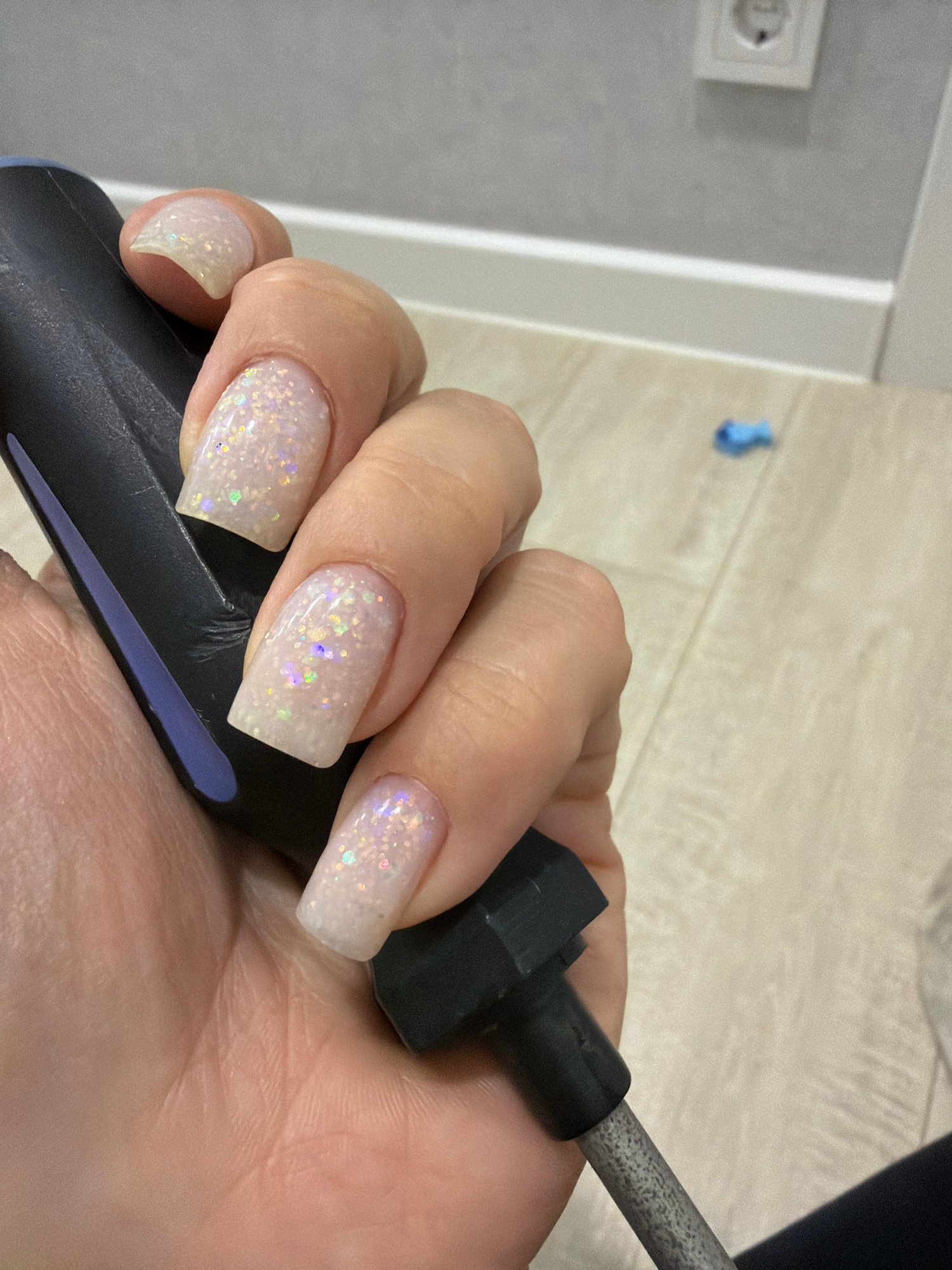 A close-up shot depicts a fair-skinned hand holding a black and grey metal tool with a plastic handle. The hand features long, square-shaped fingernails with a pale, glittery polish. The background in…read more