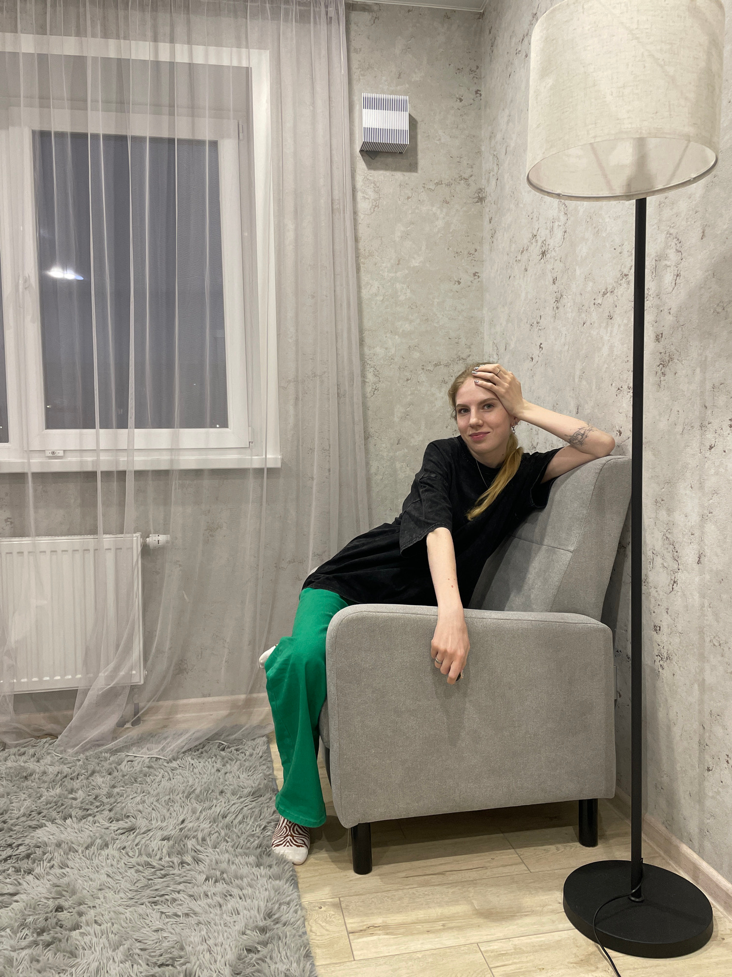 A young adult woman is reclining on a grey loveseat, appearing to pose for the camera. She has blonde hair pulled back in a ponytail, wears a black long-sleeved shirt, and green pants. Her right hand…read more