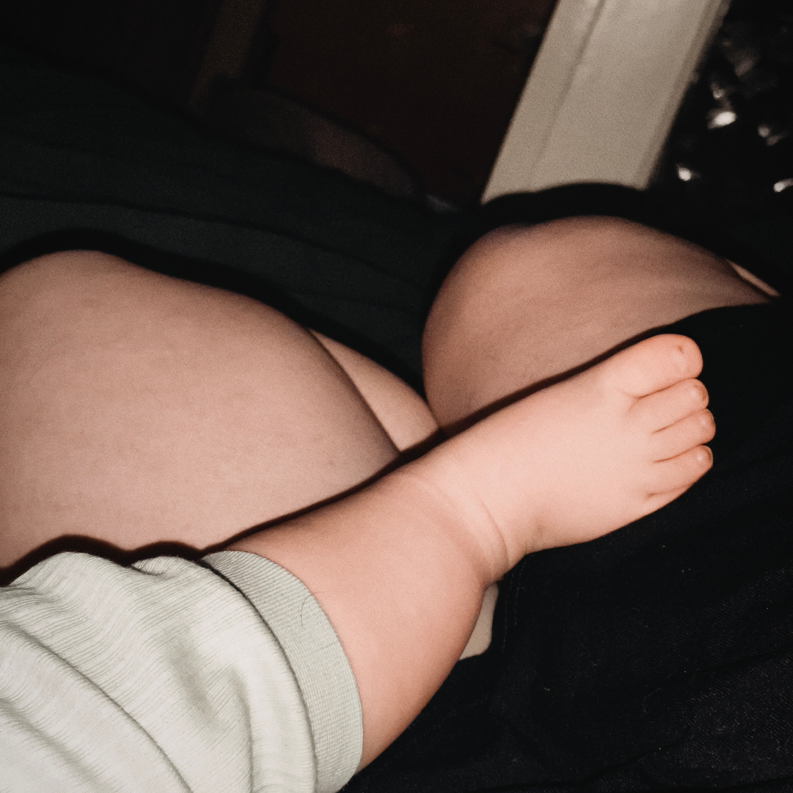 The image presents a close-up, intimate scene centered on the limbs of an adult and a baby or young child. In the foreground, the child's bare foot, with its tiny toes, rests gently on a dark fabric,…read more