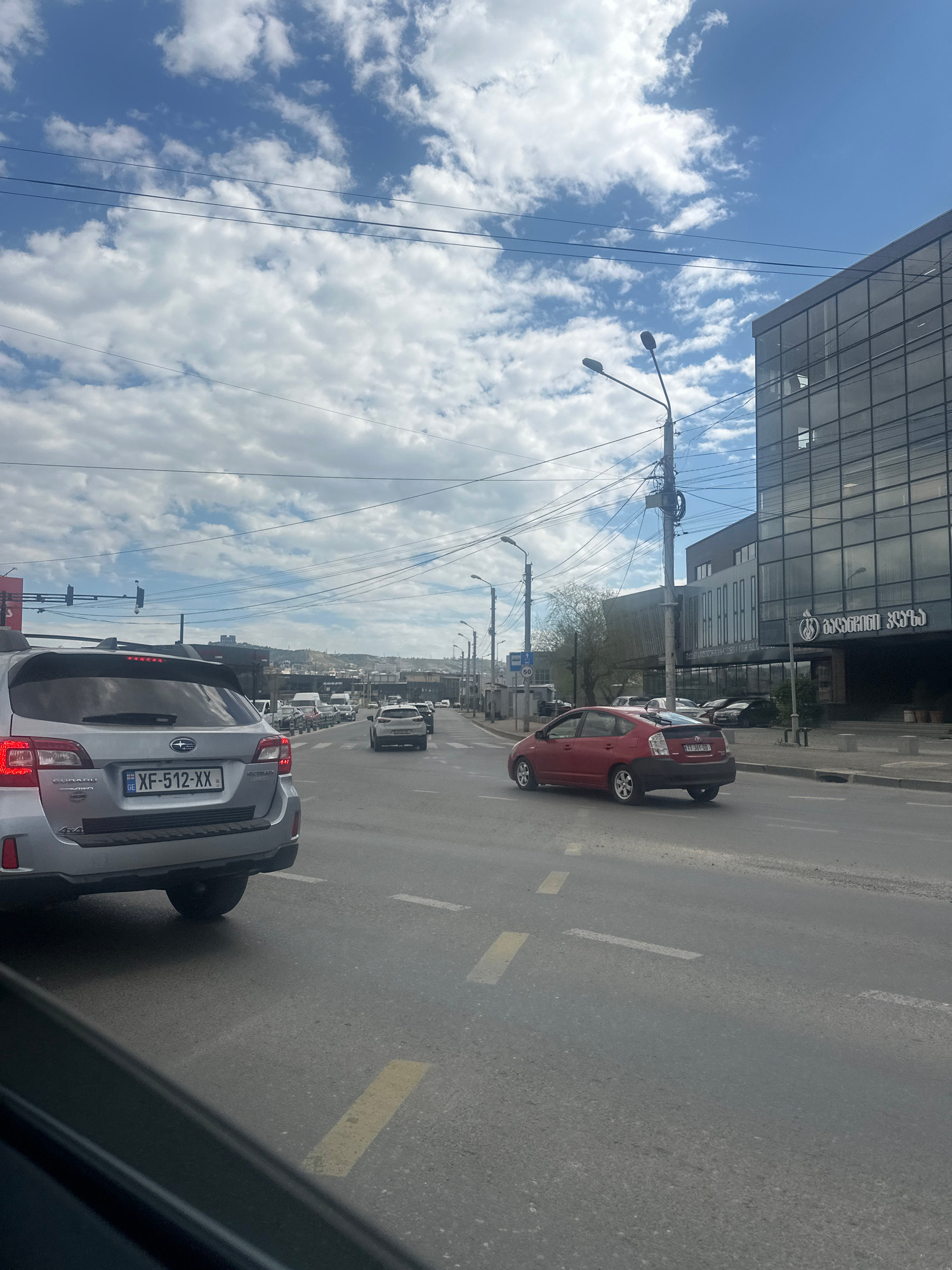 The image captures an urban street scene in Tbilisi, Georgia. The view is from within a vehicle, looking forward onto a road with moderate traffic. Prominent is a silver Subaru SUV with license plate…read more