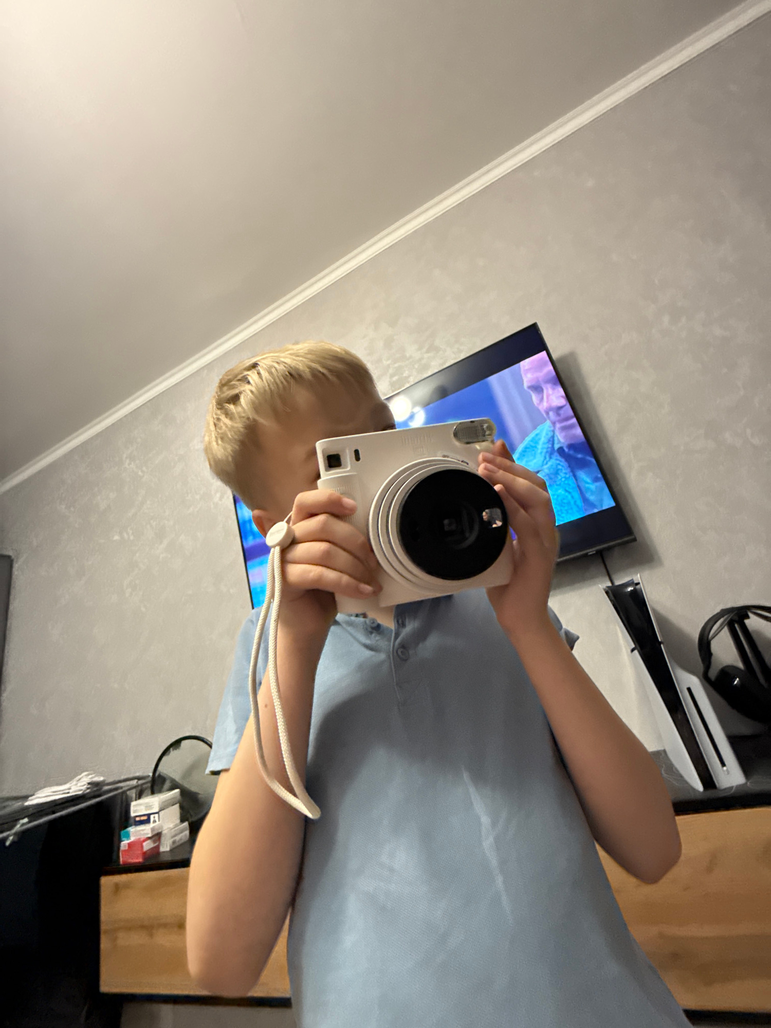 A person with blonde hair is holding a white instant camera in front of their face, obscuring it from view. They are wearing a light blue shirt. Behind them, there is a television displaying a colorfu…read more