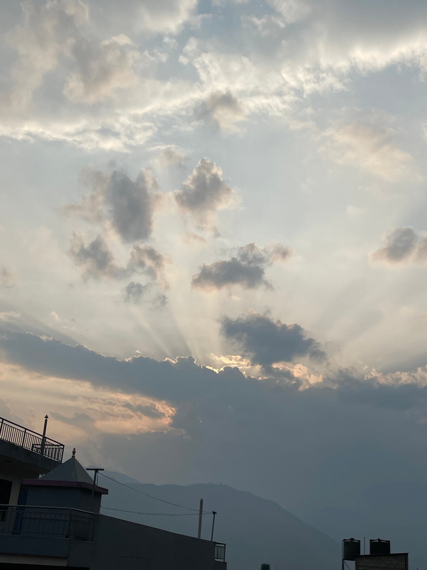 The image captures a sky view in Pokhara, Nepal, featuring a mix of white and gray clouds. Sunlight beams through the clouds, creating a dramatic effect. In the lower right corner, a building with rai…read more