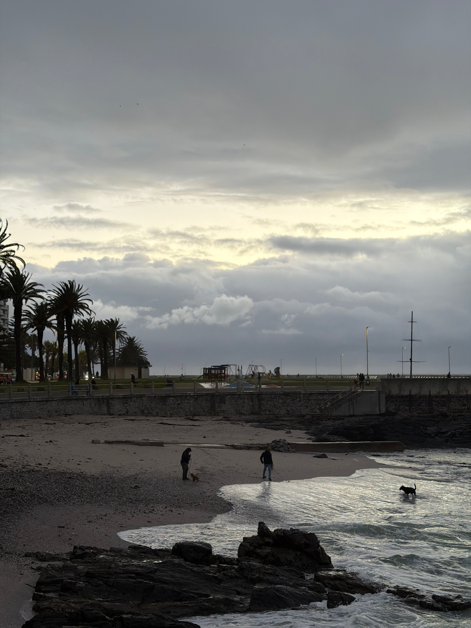 The image depicts a coastal scene in Cape Town, South Africa, likely along the Atlantic Seaboard. The sky is overcast with dramatic, grey and white clouds. The foreground features a row of palm trees…read more
