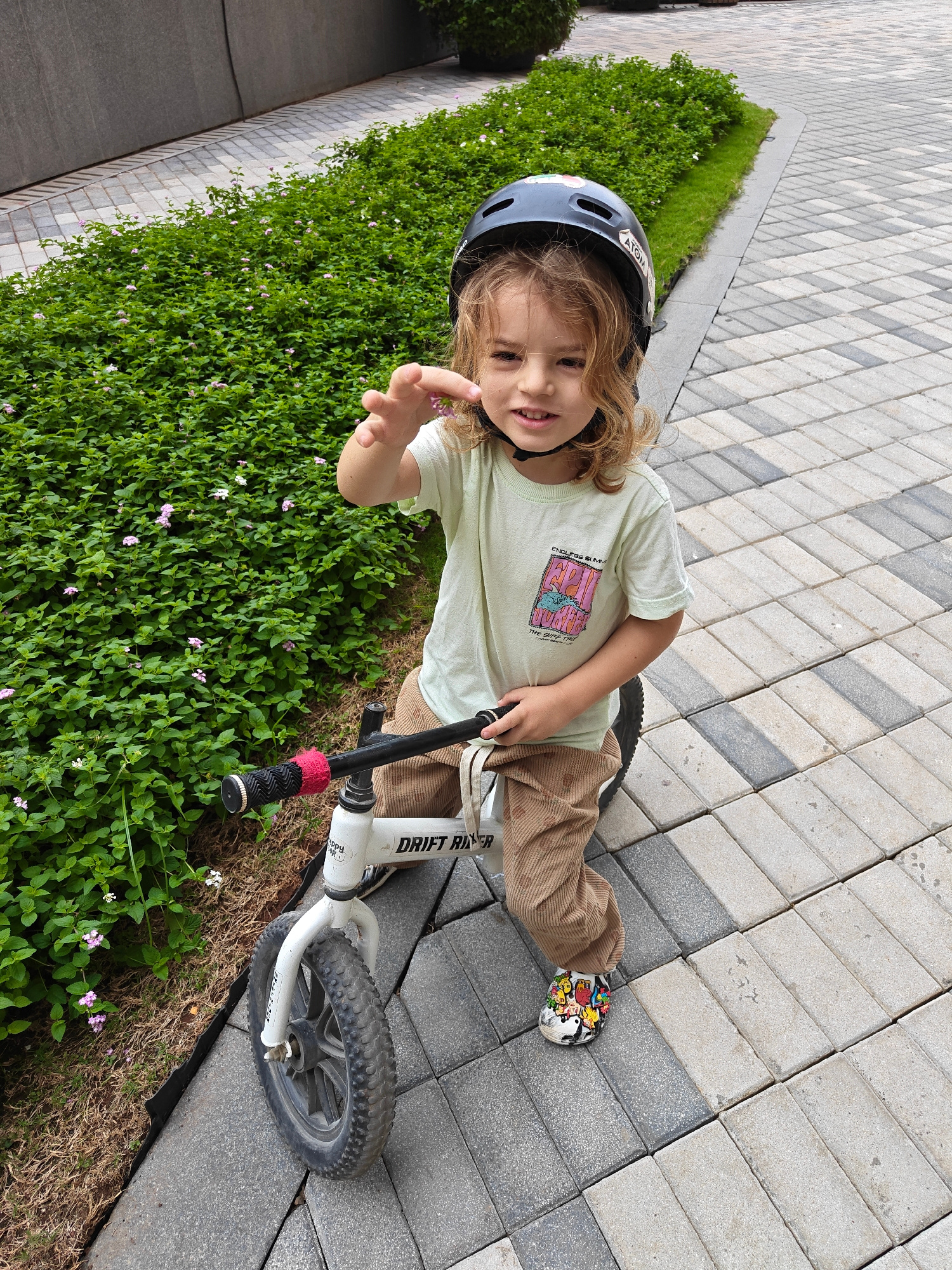 A young child with light brown, curly hair is pictured outdoors on a white balance bike. The child wears a black bike helmet, a light green short-sleeved t-shirt with a graphic design, brown corduroy…read more