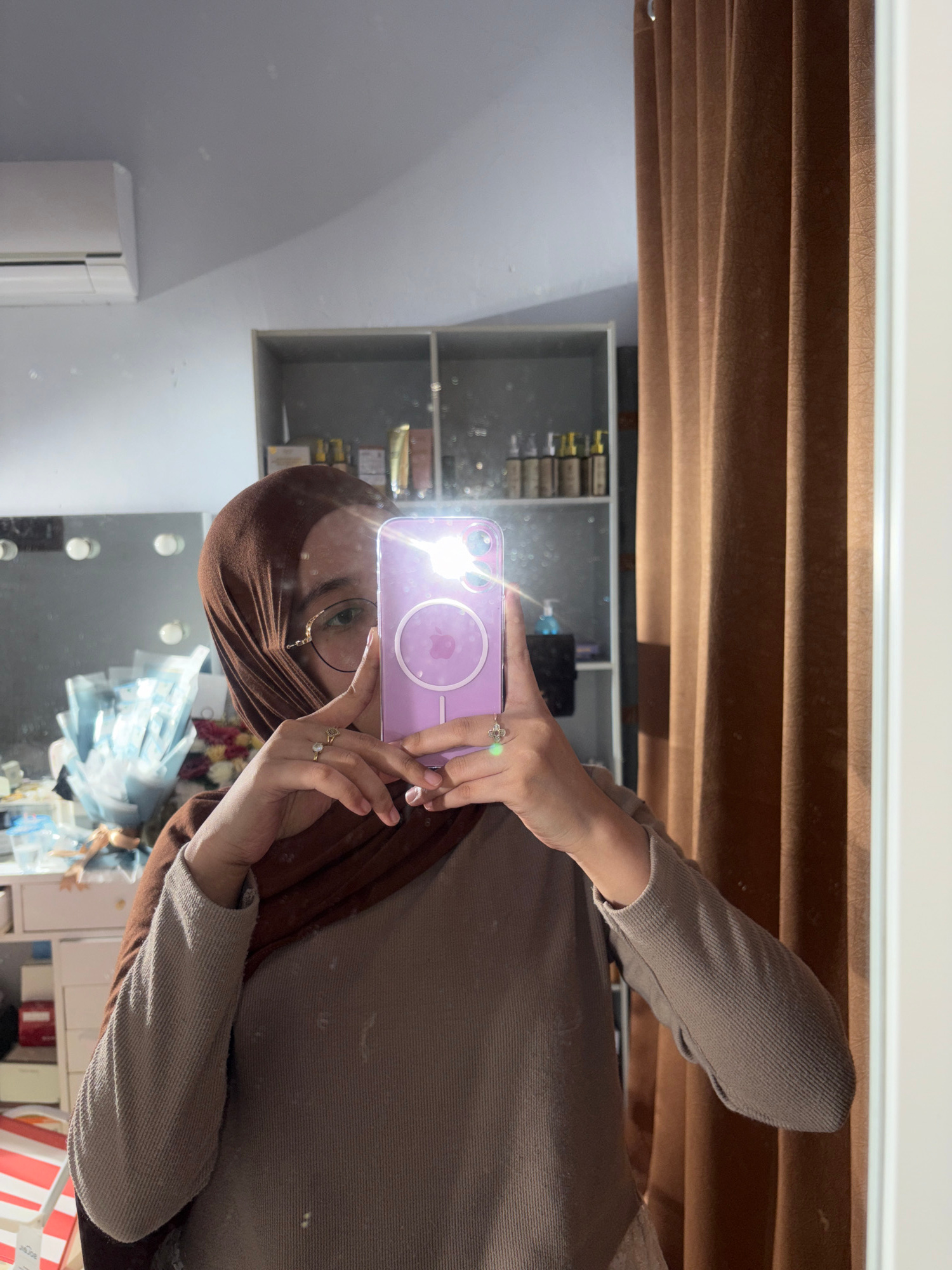 A person wearing a brown hijab, eyeglasses, and a gray top is taking a mirror selfie with a purple phone. The reflection in the mirror shows a room with a brown curtain, a shelf with various items, anβ¦read more