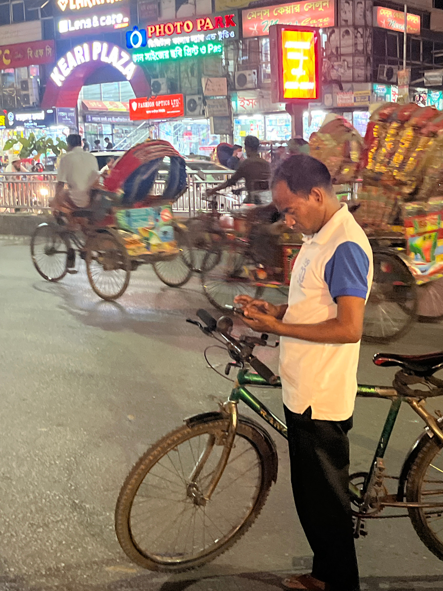 The scene is a nighttime street view in Dhaka, Bangladesh. A man is standing next to a green bicycle, seemingly working on it. He is wearing a white shirt with blue sleeves and black pants. In the bac…read more