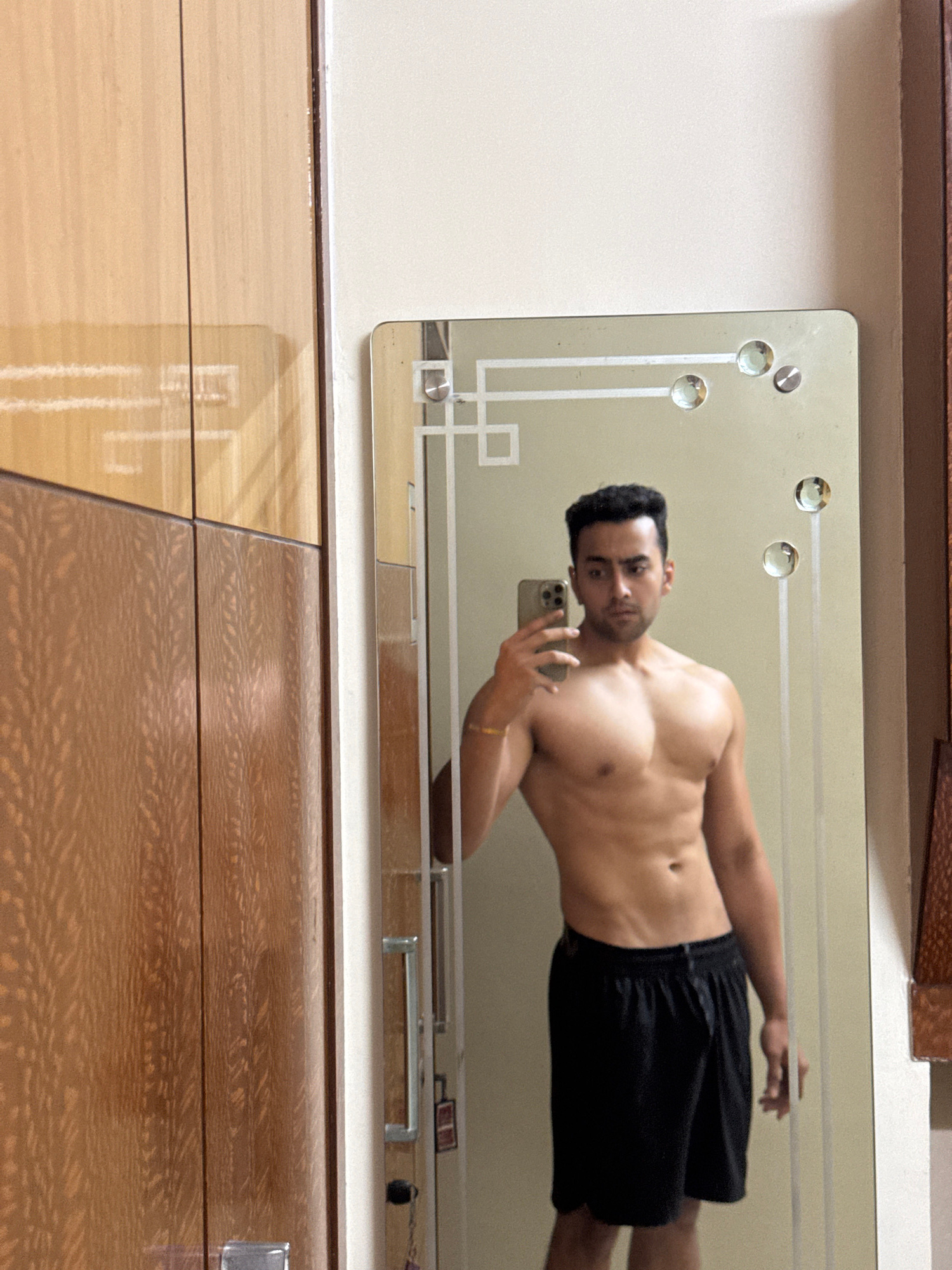 An indoor mirror selfie captures a young man's reflection from the mid-thighs up. The man is shirtless, showcasing a toned physique with visible abdominal muscles and chest. He wears black shorts andβ¦read more