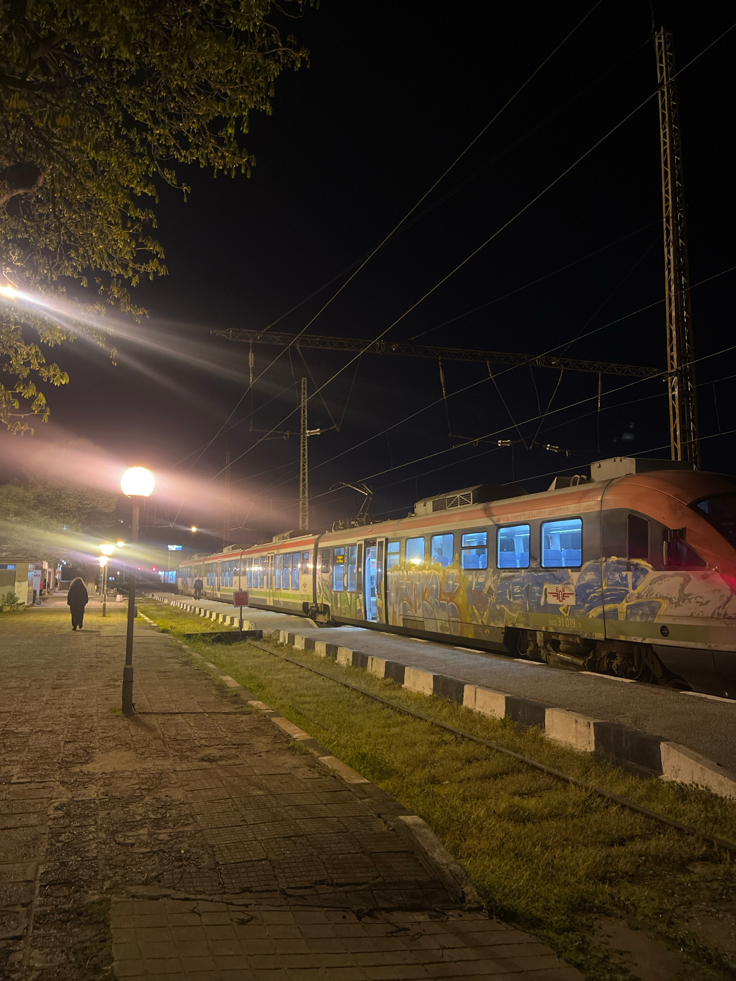 At night, an electric train is parked at a platform in Asenovgrad, Bulgaria. The train is red and silver, covered in graffiti, with lit-up windows. Overhead power lines stretch above the train. Adjace…read more