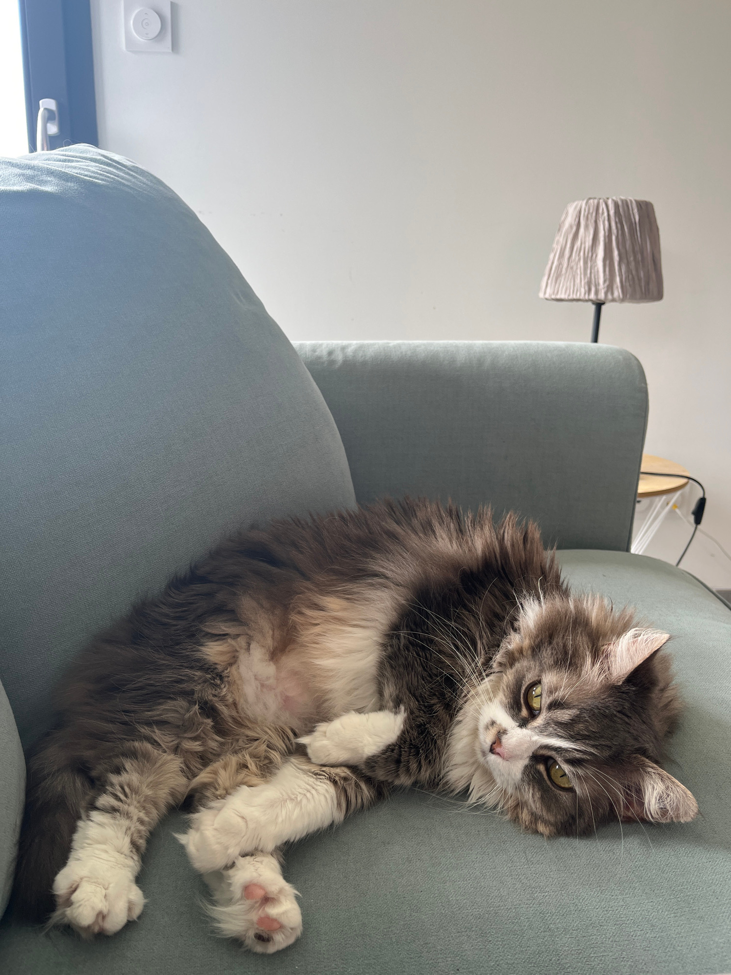 The scene is set indoors in Chambœuf, France, featuring a long-haired domestic cat resting on a light blue fabric sofa. The cat, exhibiting a grey and white coat with greenish-yellow eyes and a pink n…read more
