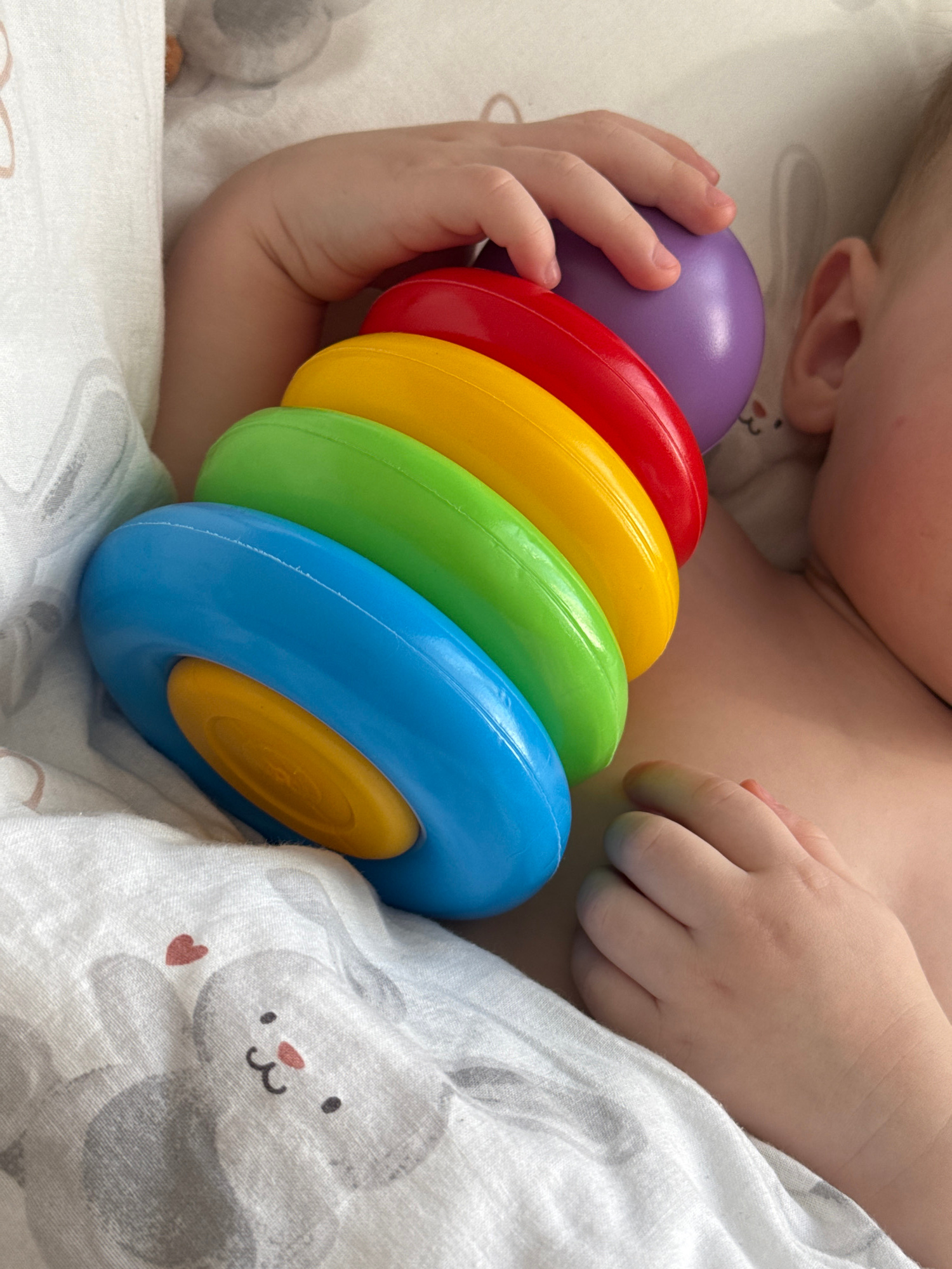An infant is lying on a white blanket with a gray bunny pattern. The infant is holding a multi-colored stacking toy consisting of purple, red, yellow, green, and blue rings. The location is unknown an…read more