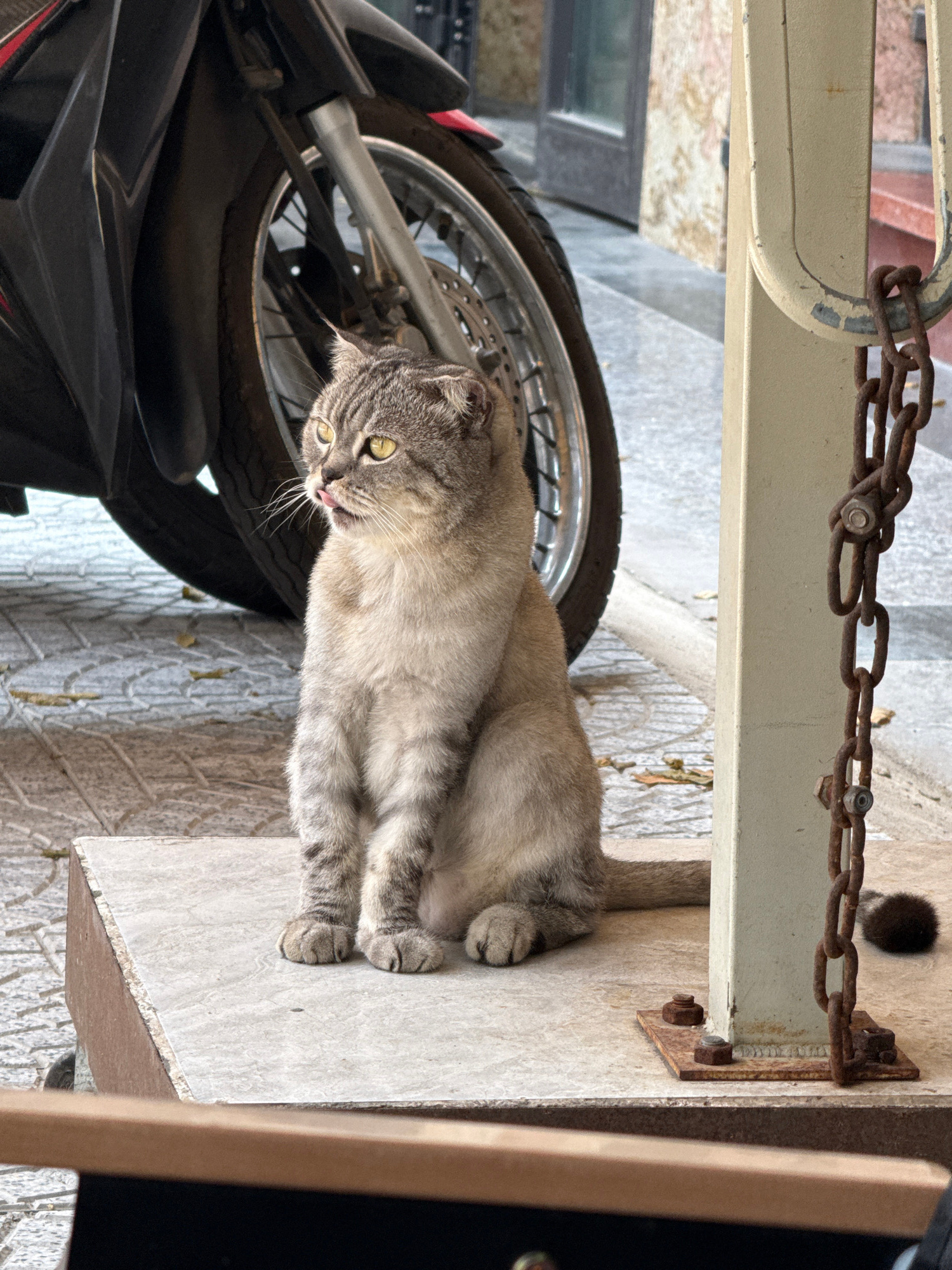A gray tabby cat is lying on a concrete shelf next to a parked motorcycle. The motorcycle is partially visible, with a black fender and a silver and black front wheel. The cat is lying on its side, wi…read more