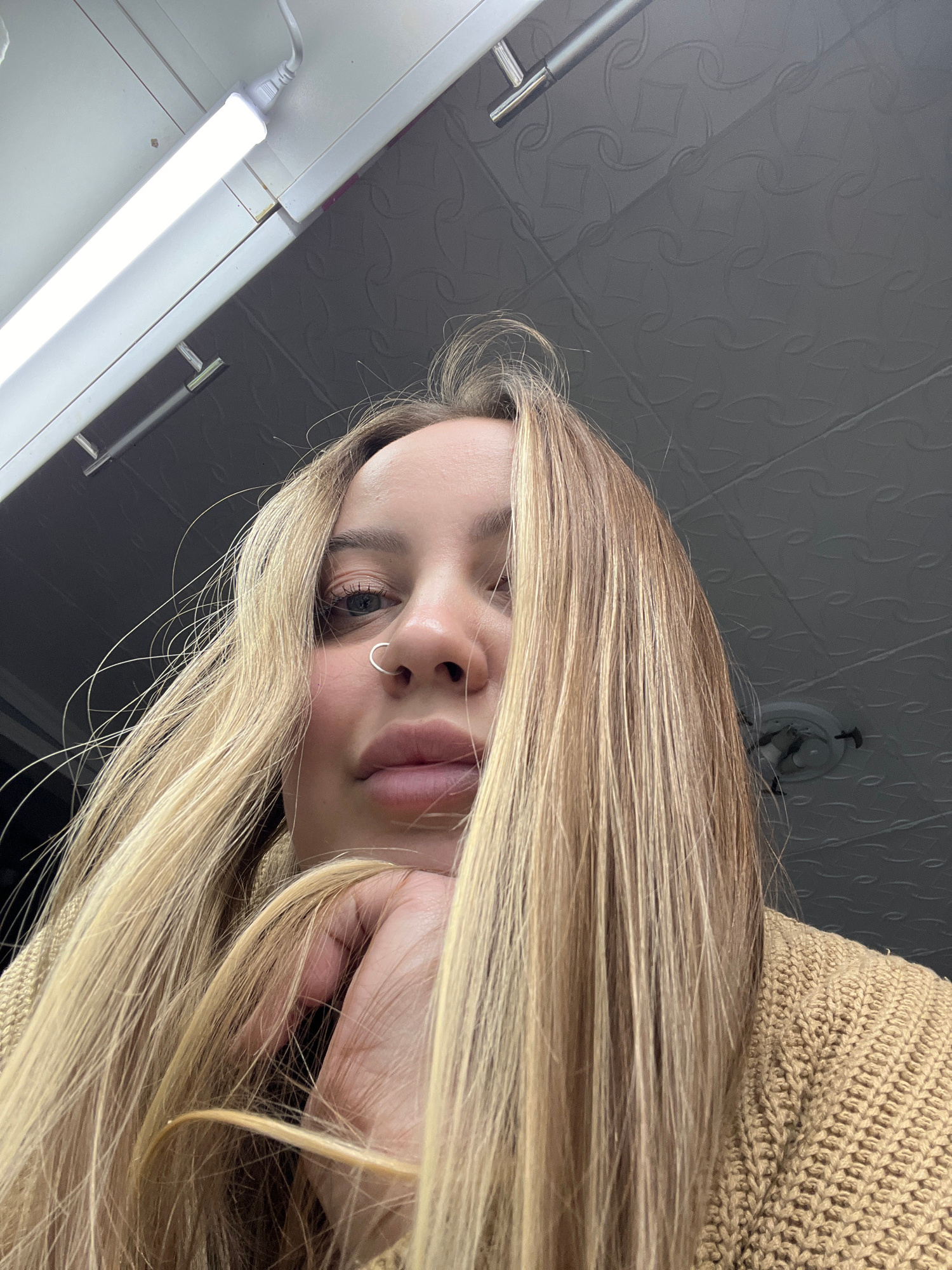 This is an upward-angled close-up portrait of a young woman, likely a selfie. Her face, including her right eye, nose, and lips, is partially visible, framed by long, straight, blonde hair. She has a…read more
