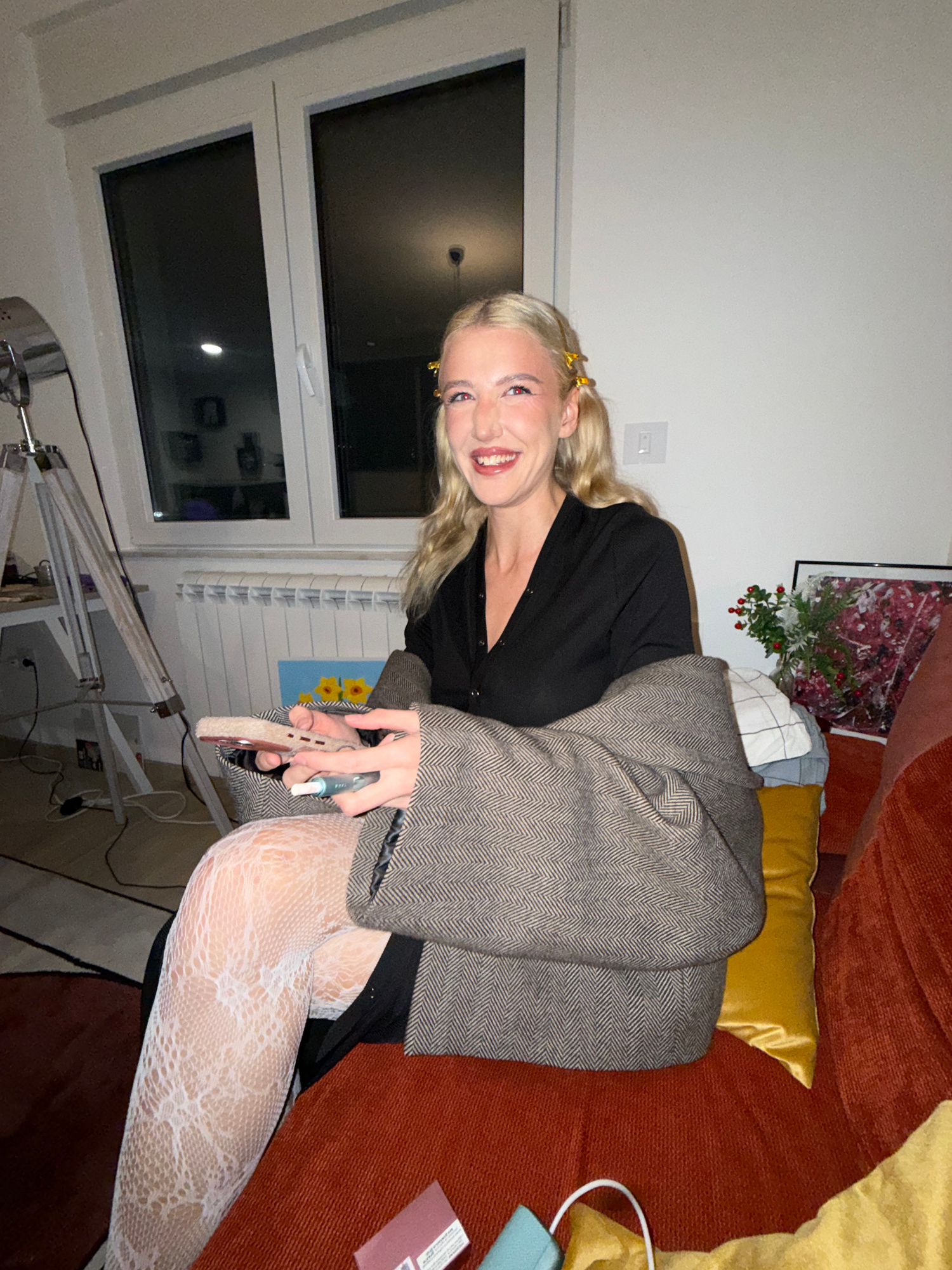 A woman is sitting on a red couch in a room with a window and a desk lamp. She is wearing white lace tights, a black shirt, and a grey herringbone blazer. She is holding a makeup sponge and a blue app…read more