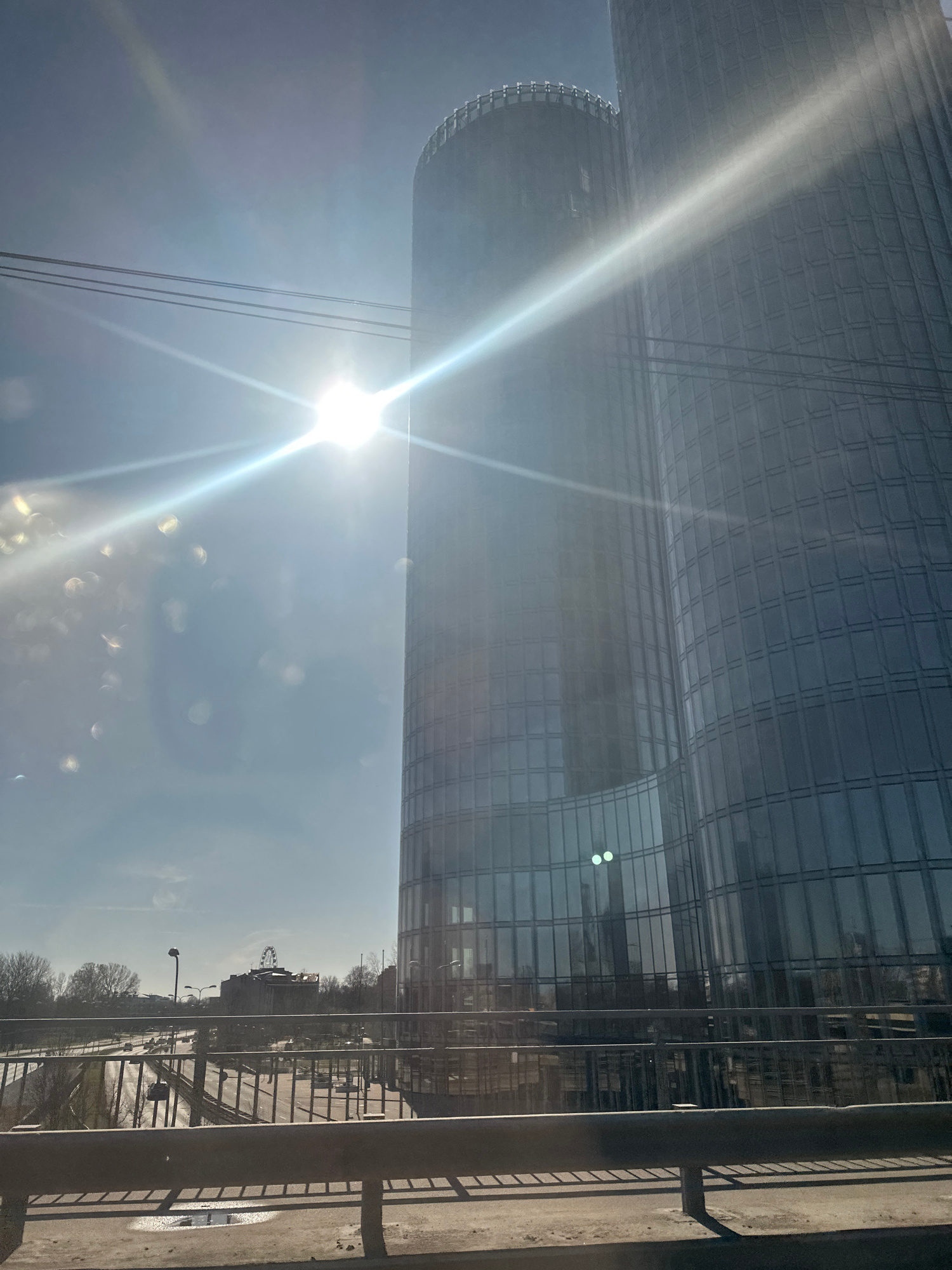 The image shows a view in Riga, Latvia. A tall, modern building with a grid-like facade dominates the left side of the frame, reflecting the bright sunlight. A circular section is visible near the bas…read more
