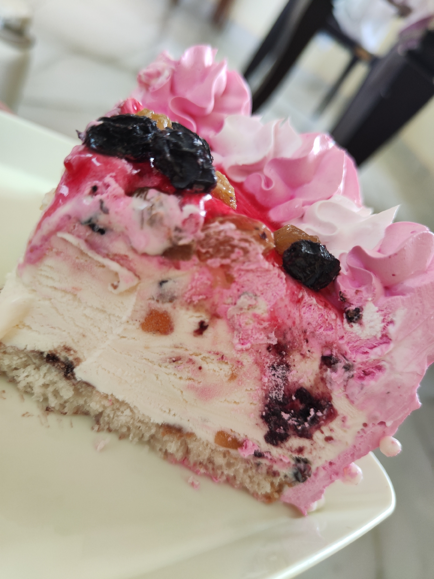 The image shows a slice of cake, likely served on a white plate. The cake features a base of sponge cake, topped with a layer of ice cream, and adorned with pink frosting, white swirls, and scattered…read more