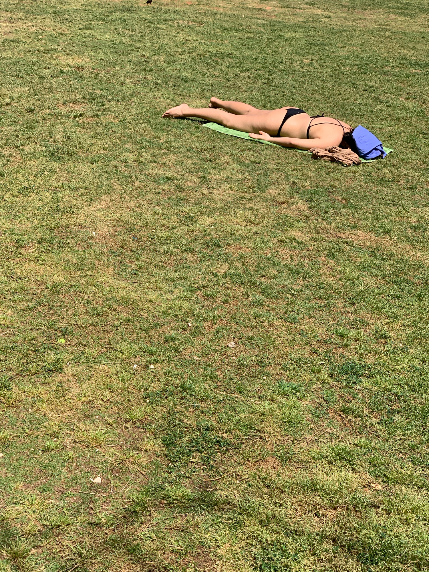 A person lies face down on a light green mat in a grassy area. The person is wearing a black bikini and has a blue garment covering their head. A pile of tan cloth is next to the person's head. The gr…read more