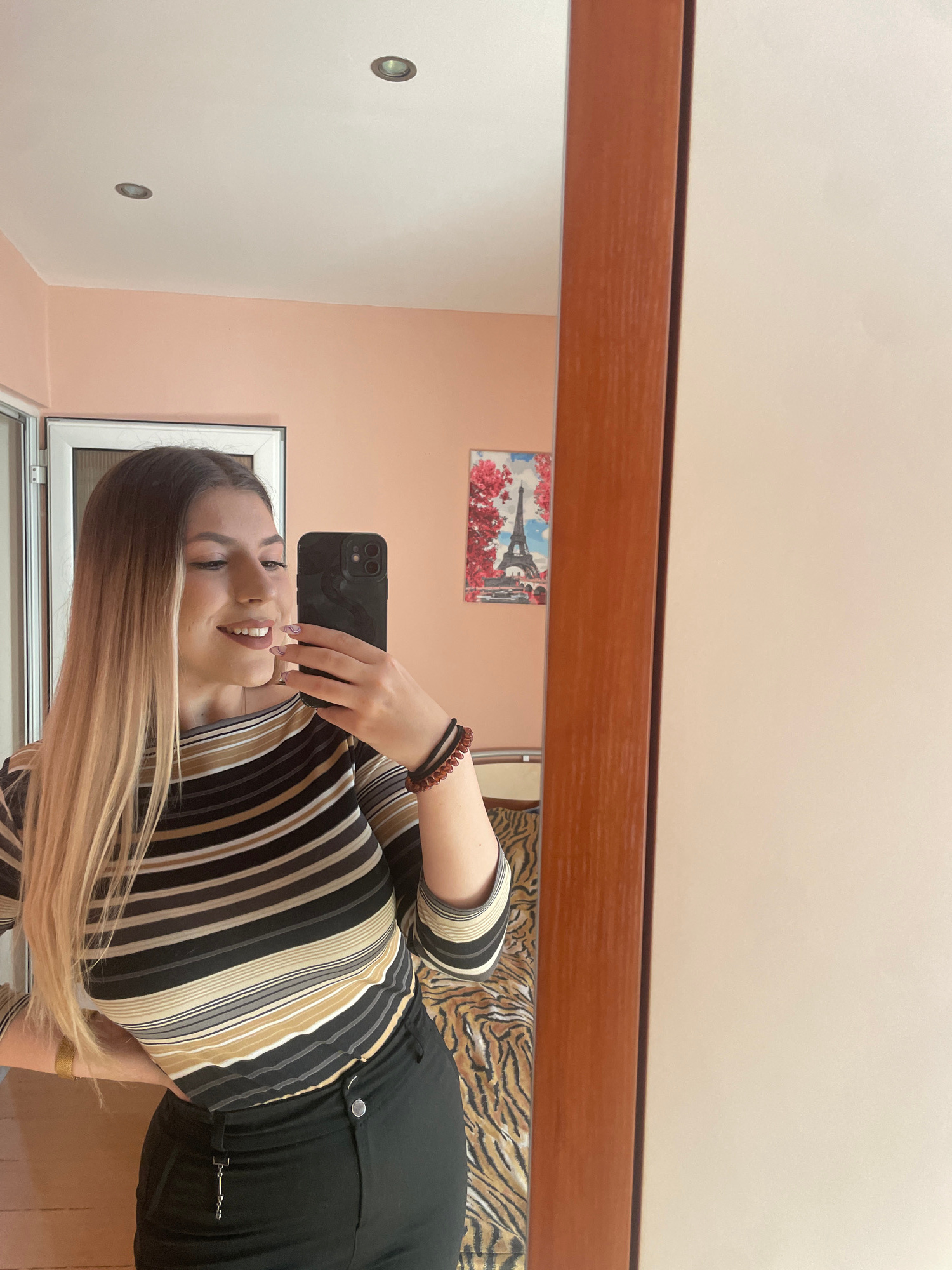 A young woman is captured in a mirror selfie, smiling brightly at the camera she holds. She has long, straight ombre hair, transitioning from dark to light blonde. She is wearing a striped, long-sleevβ¦read more