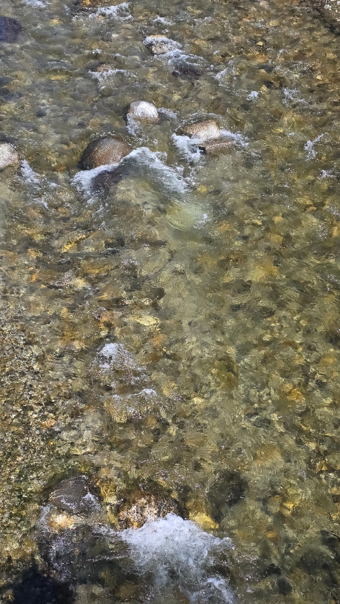 The image shows a view of a shallow riverbed with clear, flowing water. Rocks and pebbles of varying sizes are visible beneath the surface of the water. Water is turbulent in places. The image appears…read more