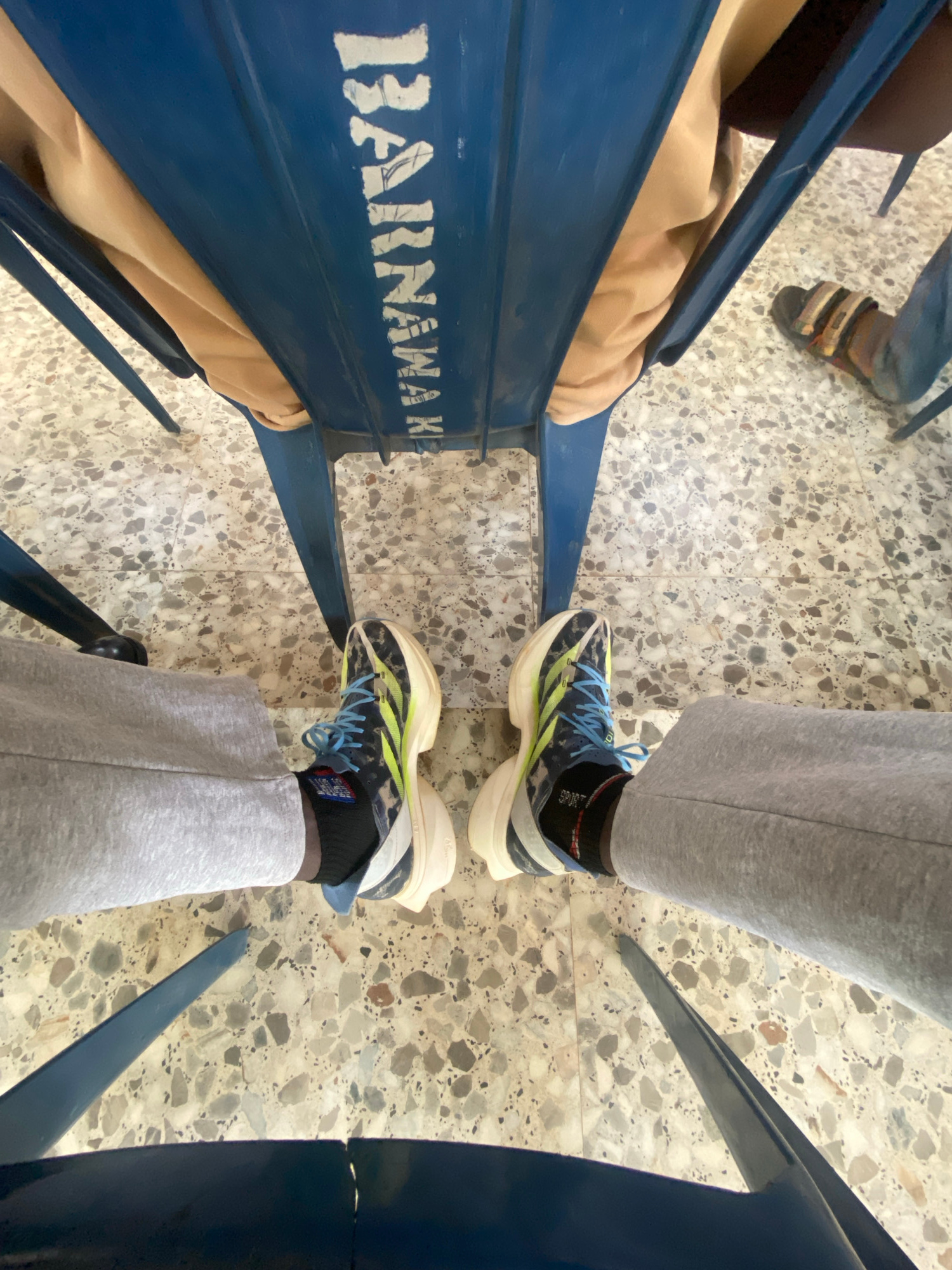 The image shows a view from above, looking down on three people seated in blue metal chairs on a terrazzo floor. One person is wearing sandals, another is wearing grey sweatpants and running shoes wit…read more