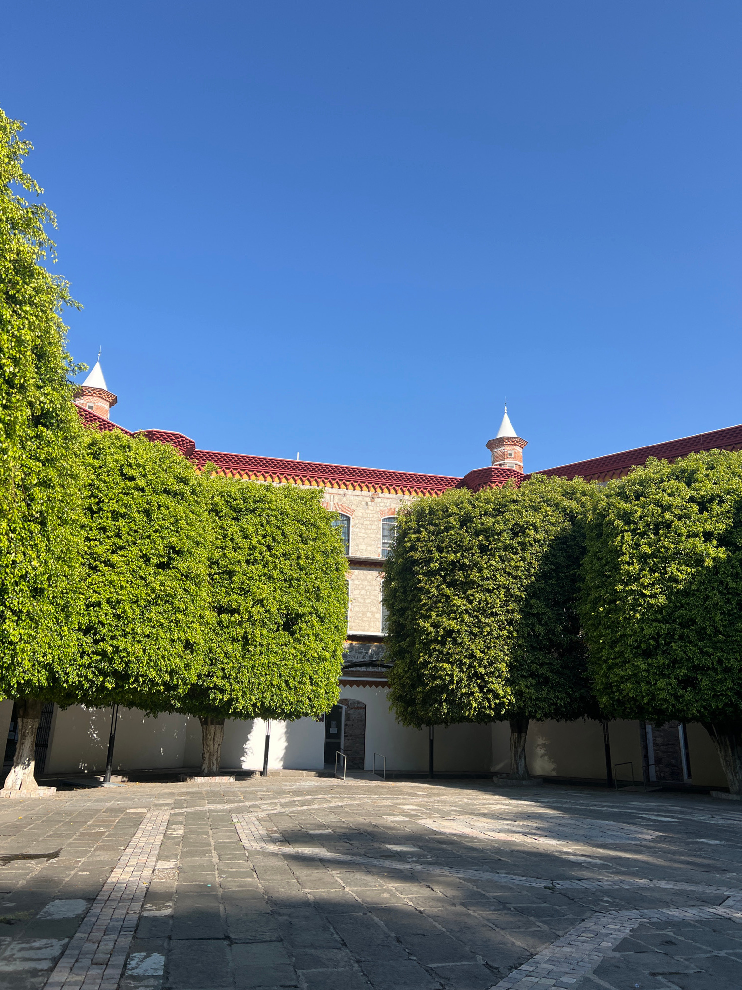 The image captures a view of a building in Puebla, Mexico, characterized by a historical architectural style. The building features stone construction, a red-tiled roof, and decorative elements. Green…read more