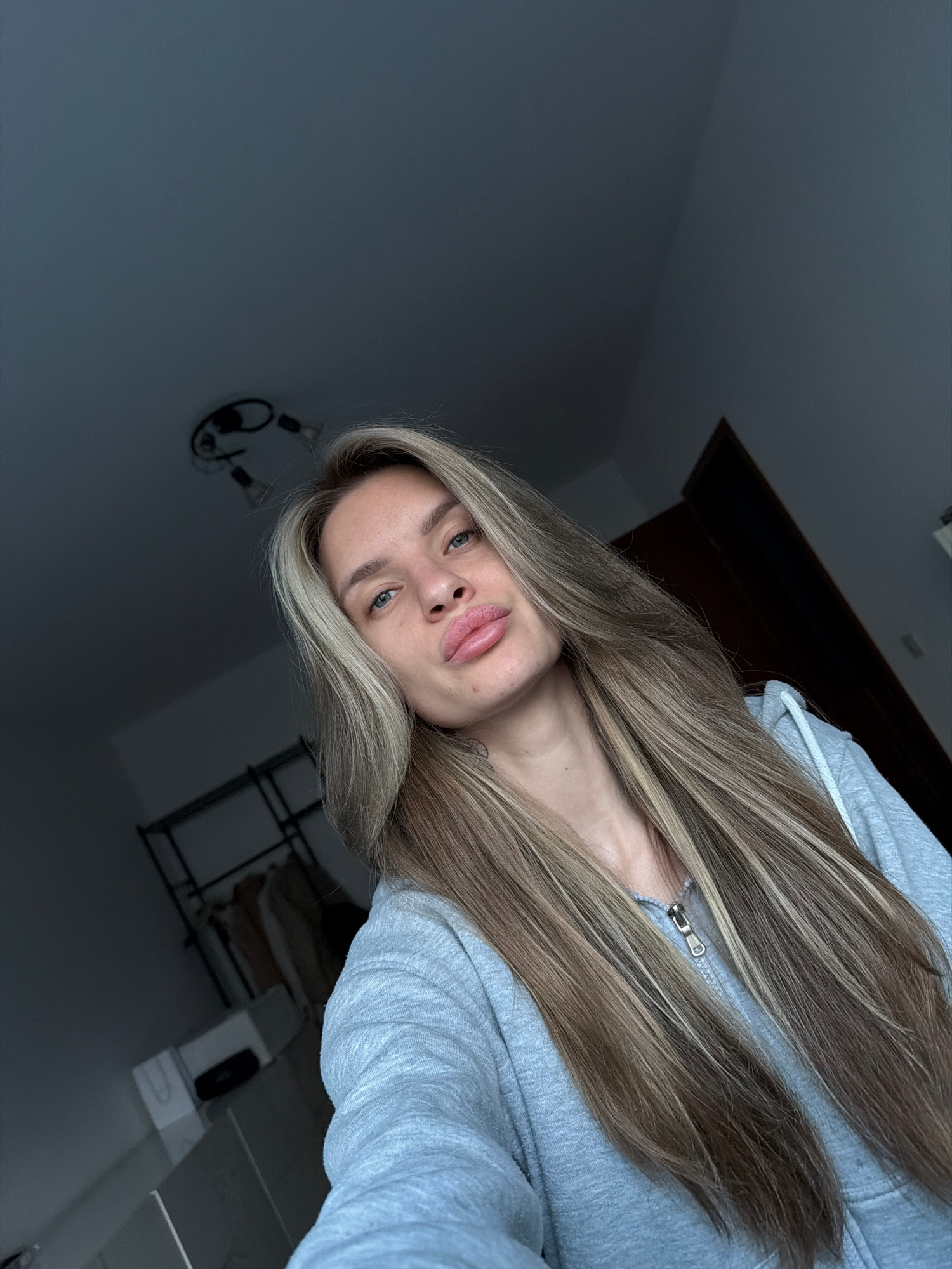A young woman with long, highlighted blonde hair and blue eyes is pictured from a low angle, tilting her head to the right. She's wearing a light gray hooded sweatshirt, partially zipped. Behind her,…read more